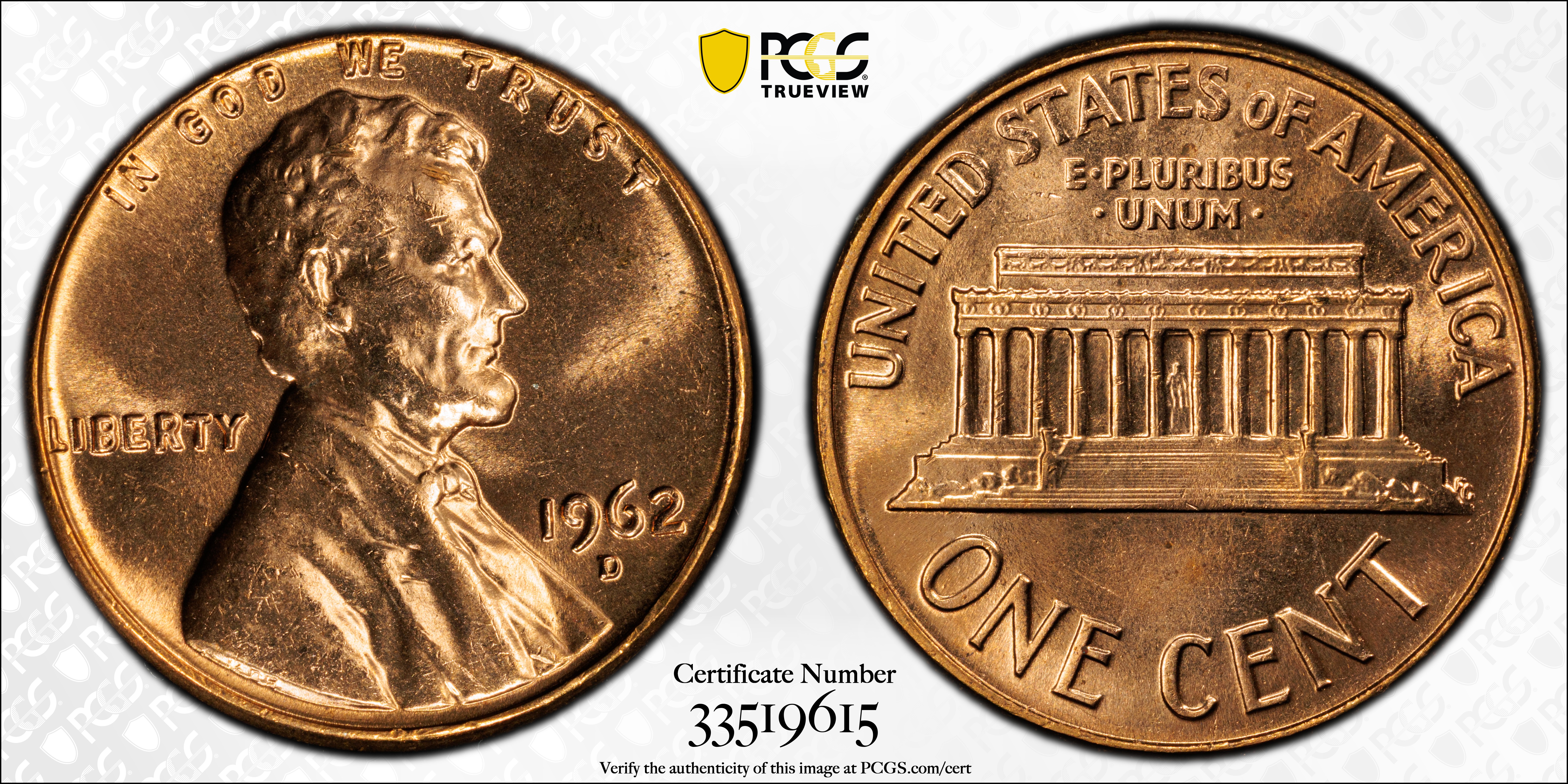 1962-D 1C, RD MS66RD 认证号33519615, PCGS号2881