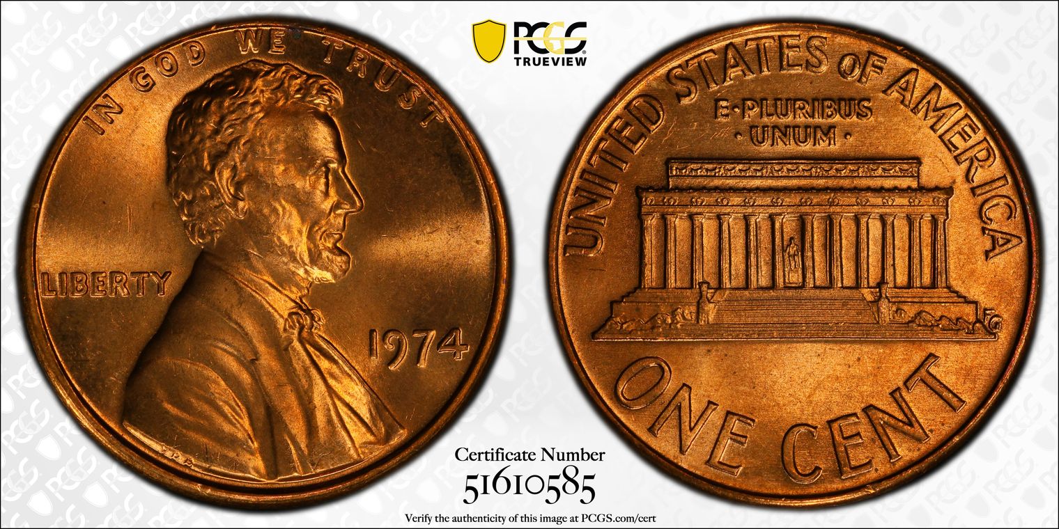 1974 1C, RD MS67RD 认证号51610585, PCGS号2971