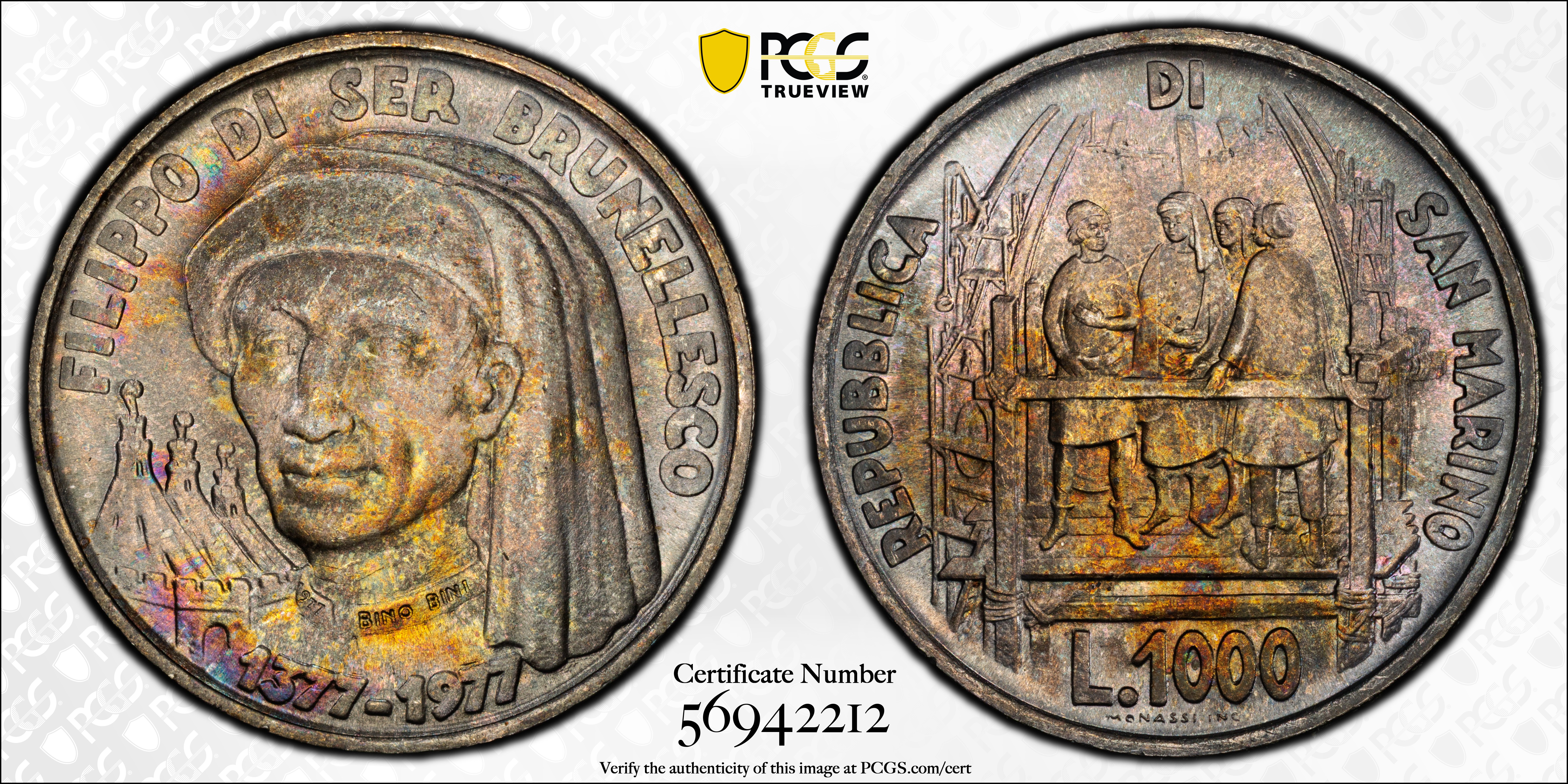 1977 1000 L Birth of Brunelleschi MS67 认证号56942212, PCGS号448248