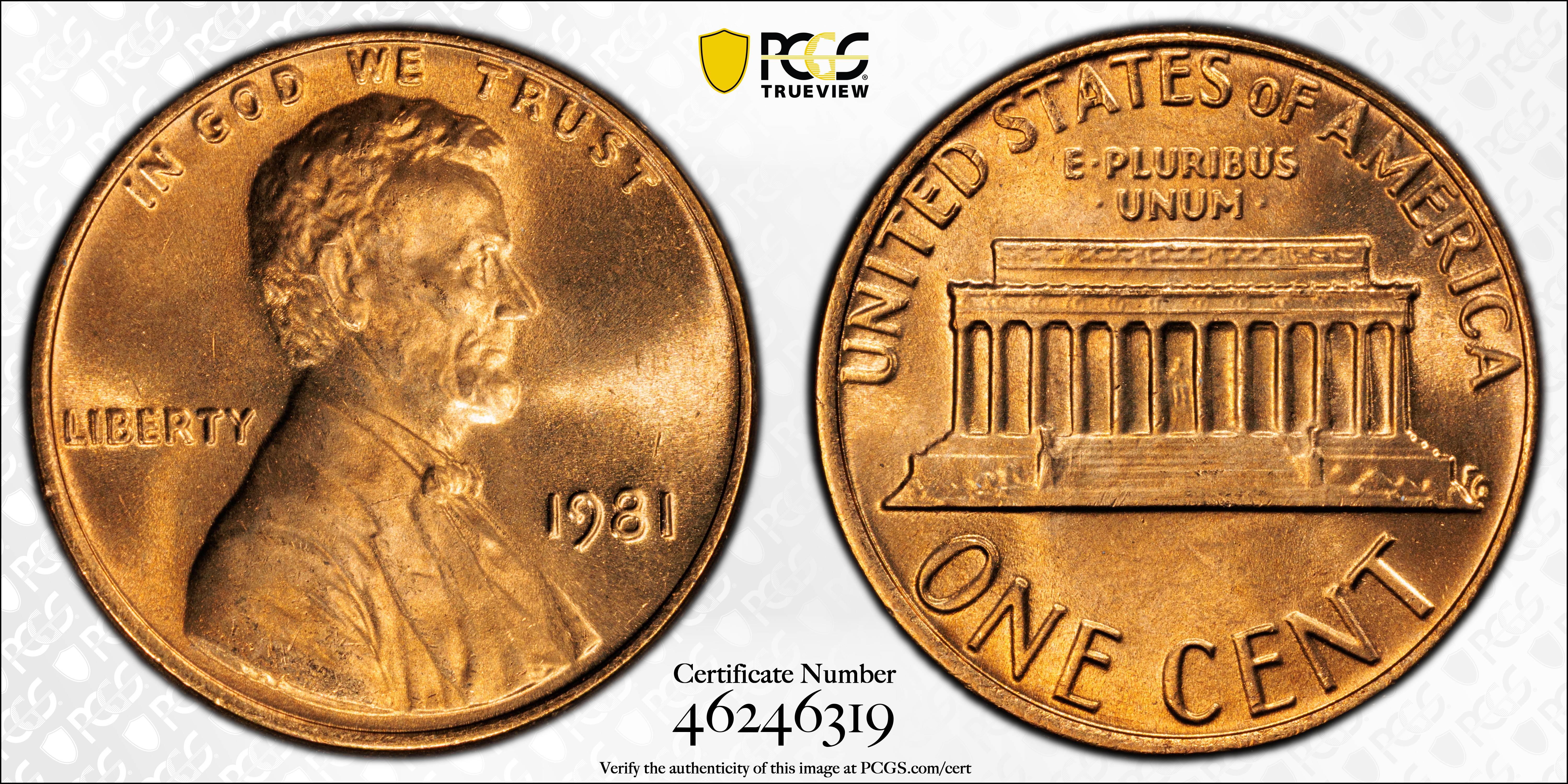 1981 1C, RD MS67RD 认证号46246319, PCGS号3043