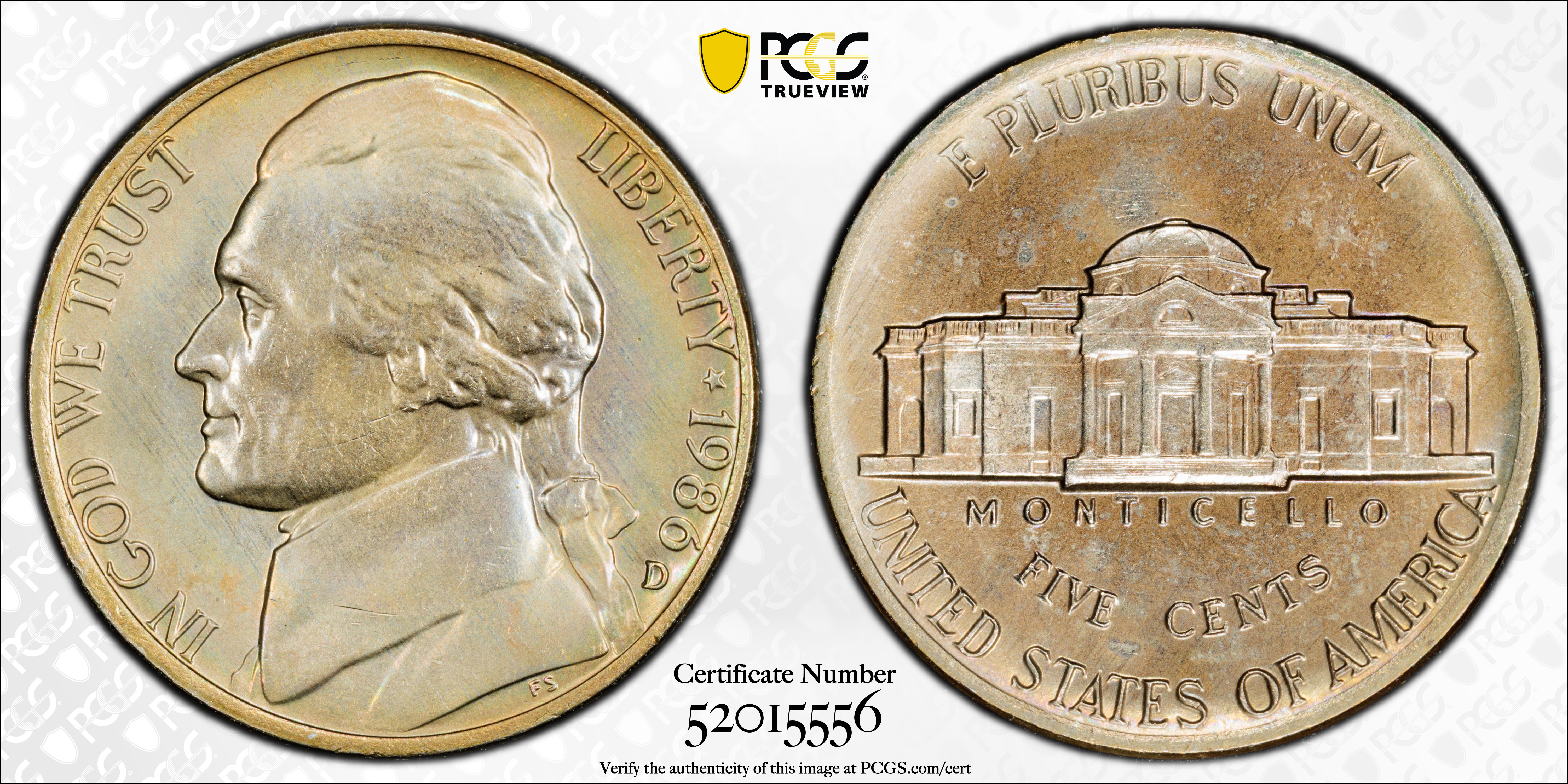1986-D 5C MS65 认证号52015556, PCGS号4117