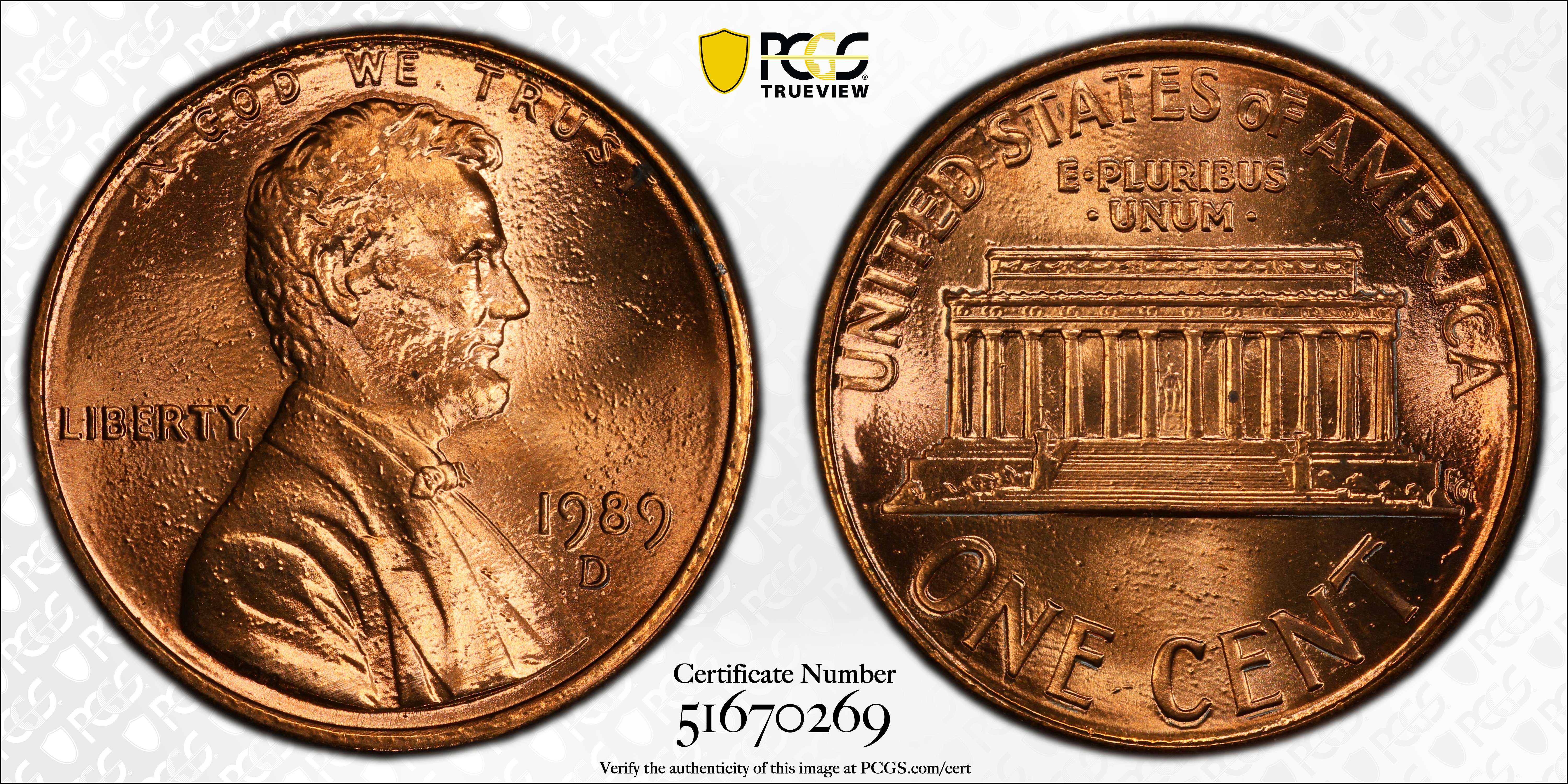 1989-D 1C, RD MS68RD 认证号51670269, PCGS号3089