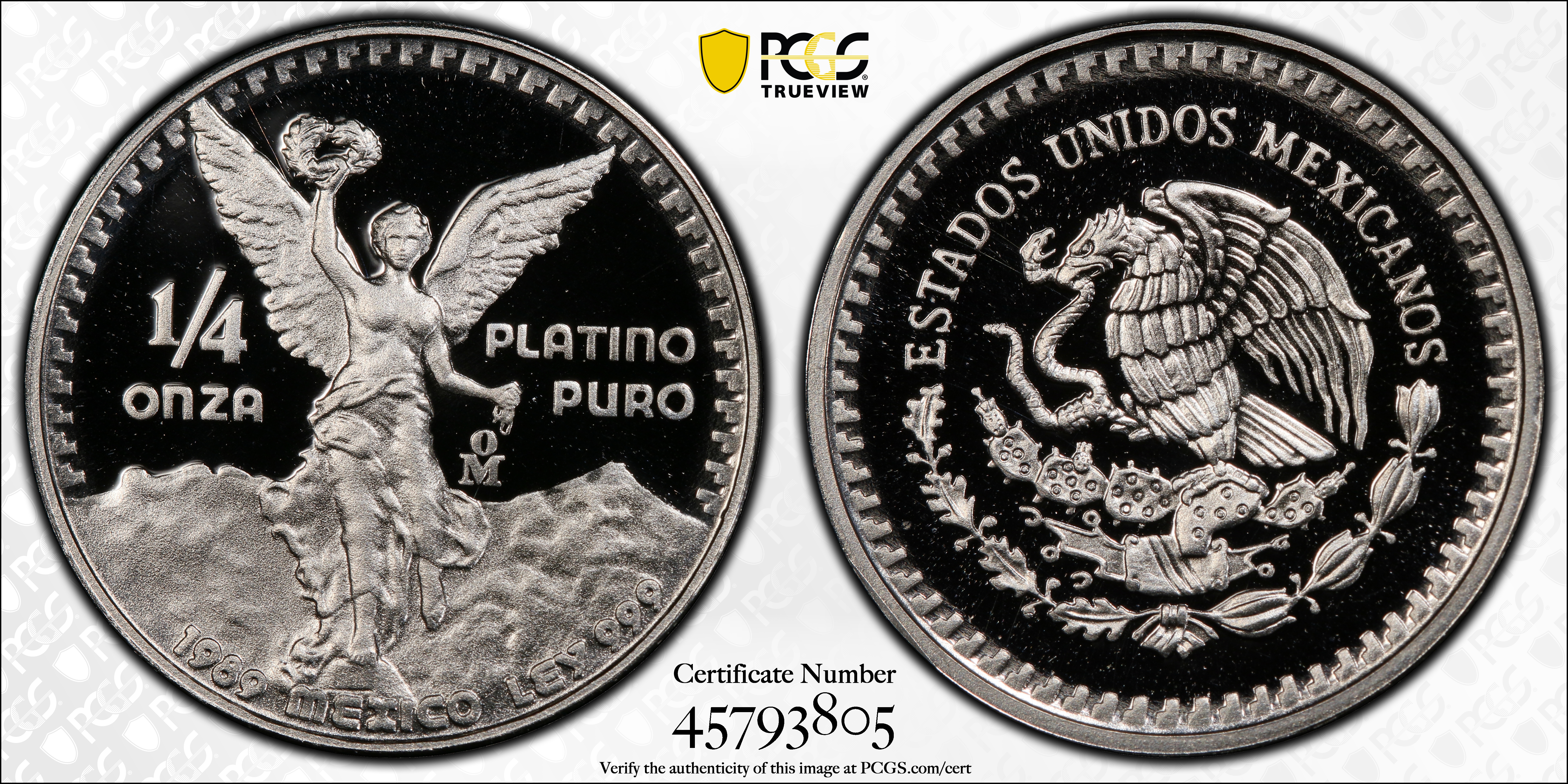 1989-Mo 1/4 oz Libertad Pt, DCAM PR70DCAM 认证号45793805, PCGS号390324