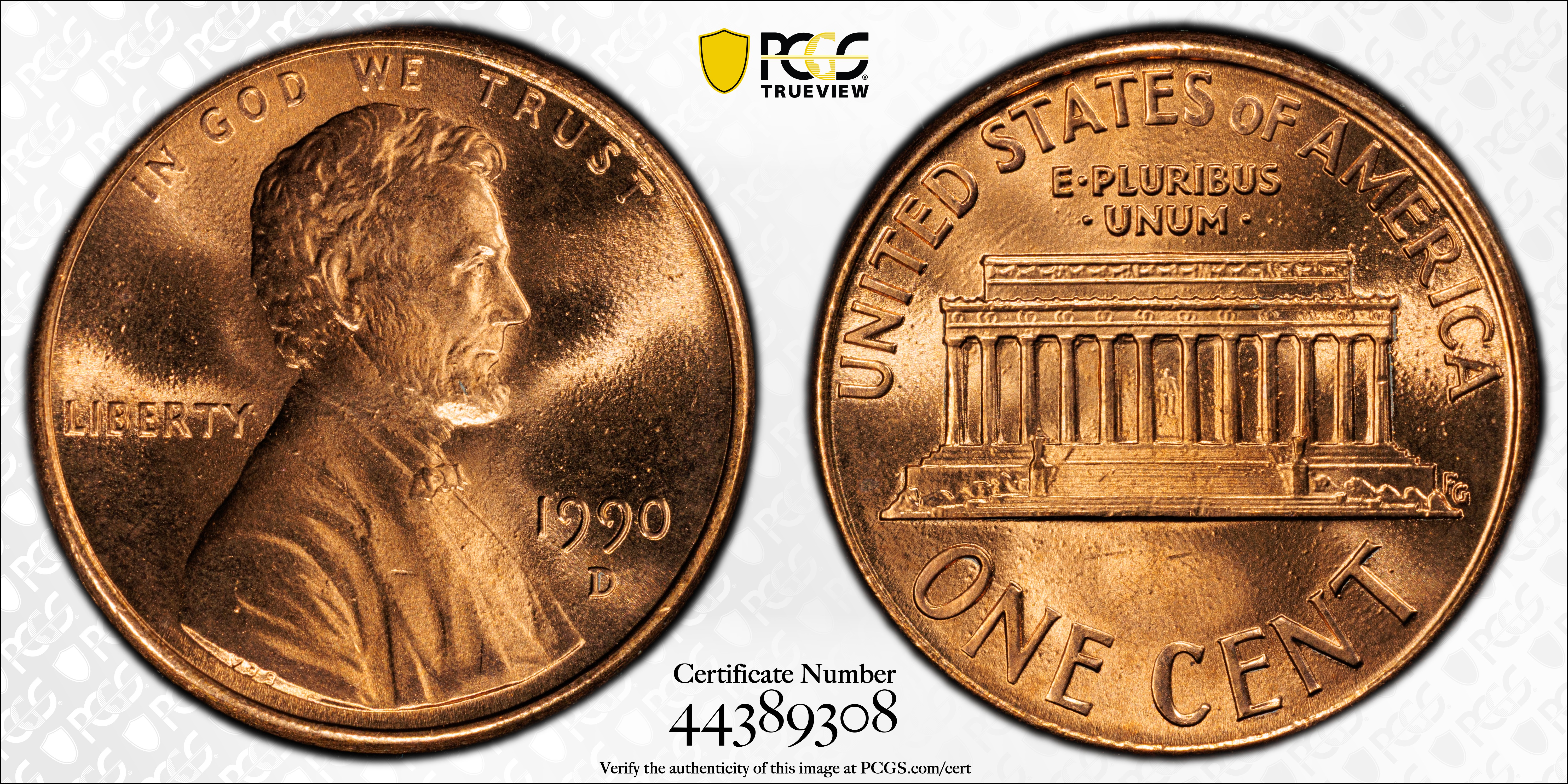 1990-D 1C, RD MS68RD 认证号44389308, PCGS号3086