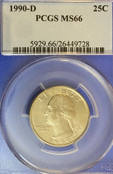 The 1990-D Washington Quarter is very common as the Mint struck them in the hundreds of millions. Only examples in MS66 appear to be somewhat scarce but still easily obtainable at a very small premium. Examples in MS67 condition are really scarce with less than a few dozen known. There is at least one known example in PCGS MS67+ condition but none have been graded higher.