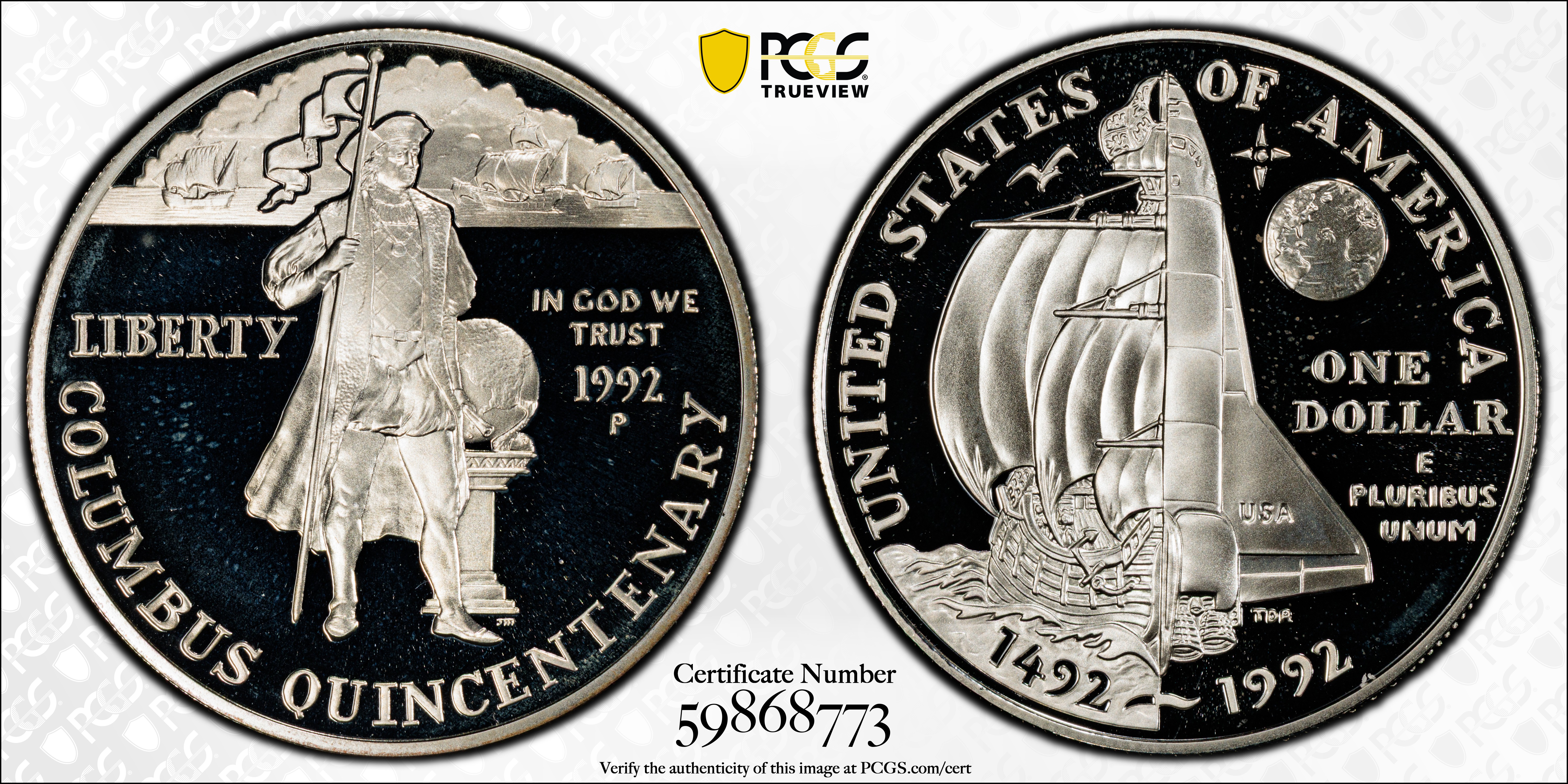 1992-P $1 Columbus Mercanti Signature, DCAM PR68DCAM 认证号59868773, PCGS号519776