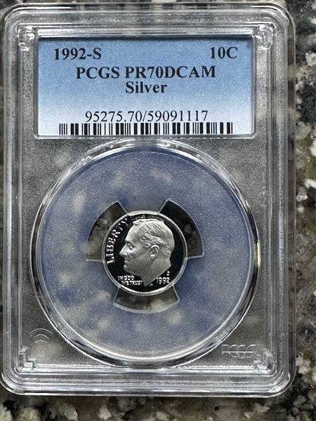 The 1992-S Silver Proof Dime is not a scarce coin with a mintage of well over 1 million. Most examples that exist are in grades of PR63 - PR68. Only examples in PR69 become somewhat difficult to find, but yet, can be purcahsed at a very small premium over the spot price of the coin. In PR70 condition, it is a bit tough with a couple hundred examples graded in this grade by PCGS.