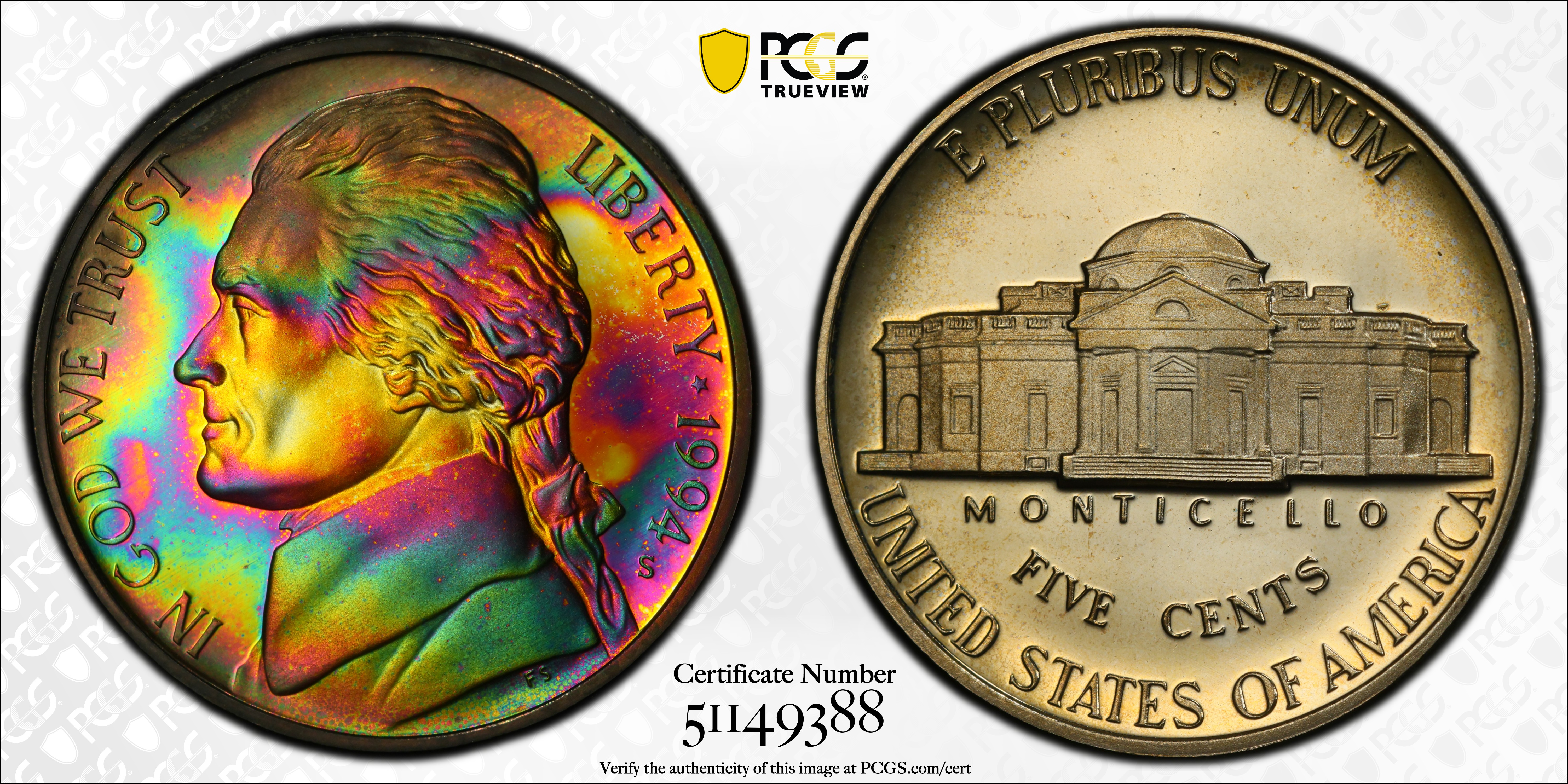 1994-S 5C, DCAM PR68+ DCAM 认证号51149388, PCGS号94229