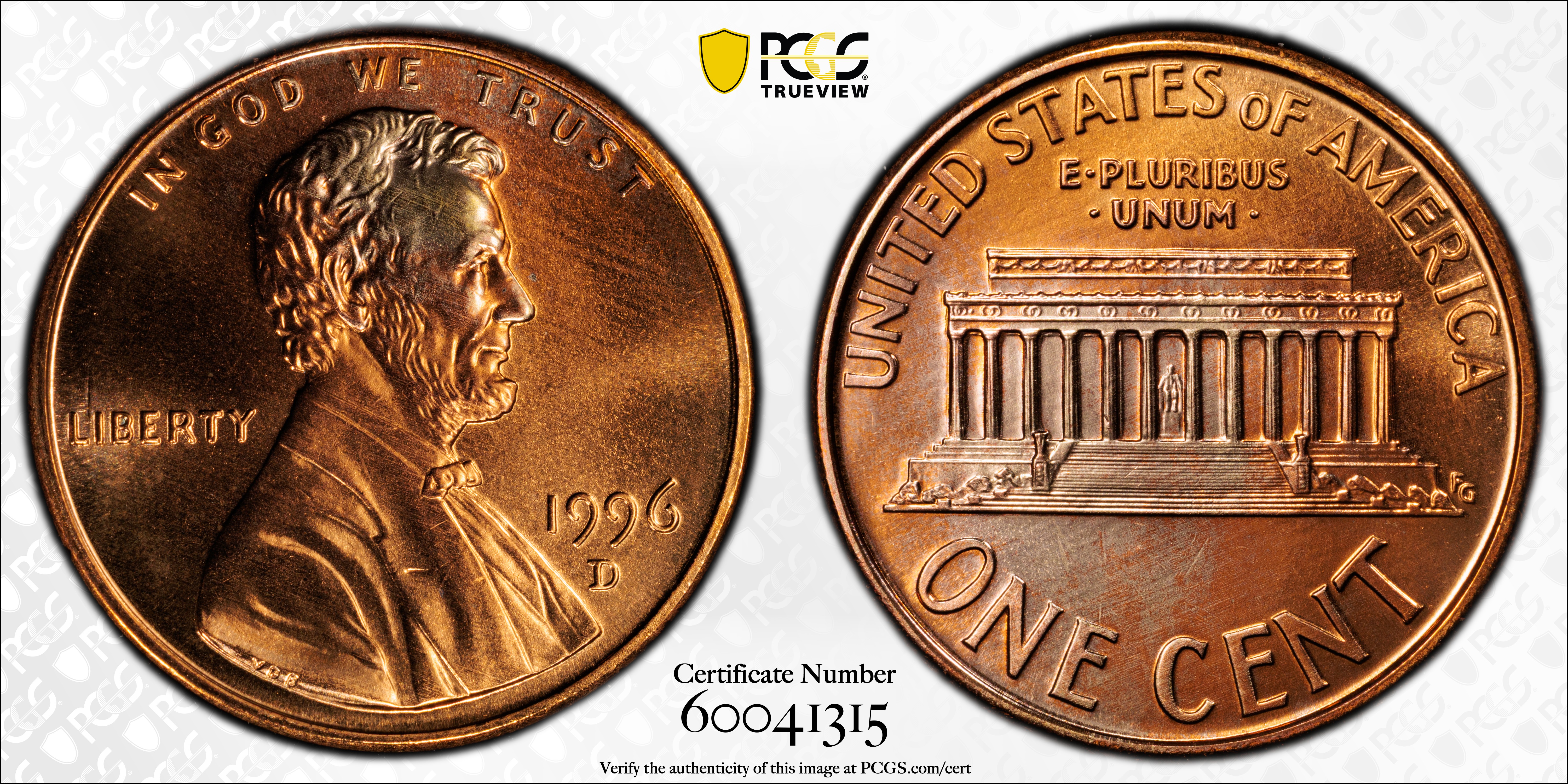 1996-D 1C, RD MS68RD 认证号60041315, PCGS号3139