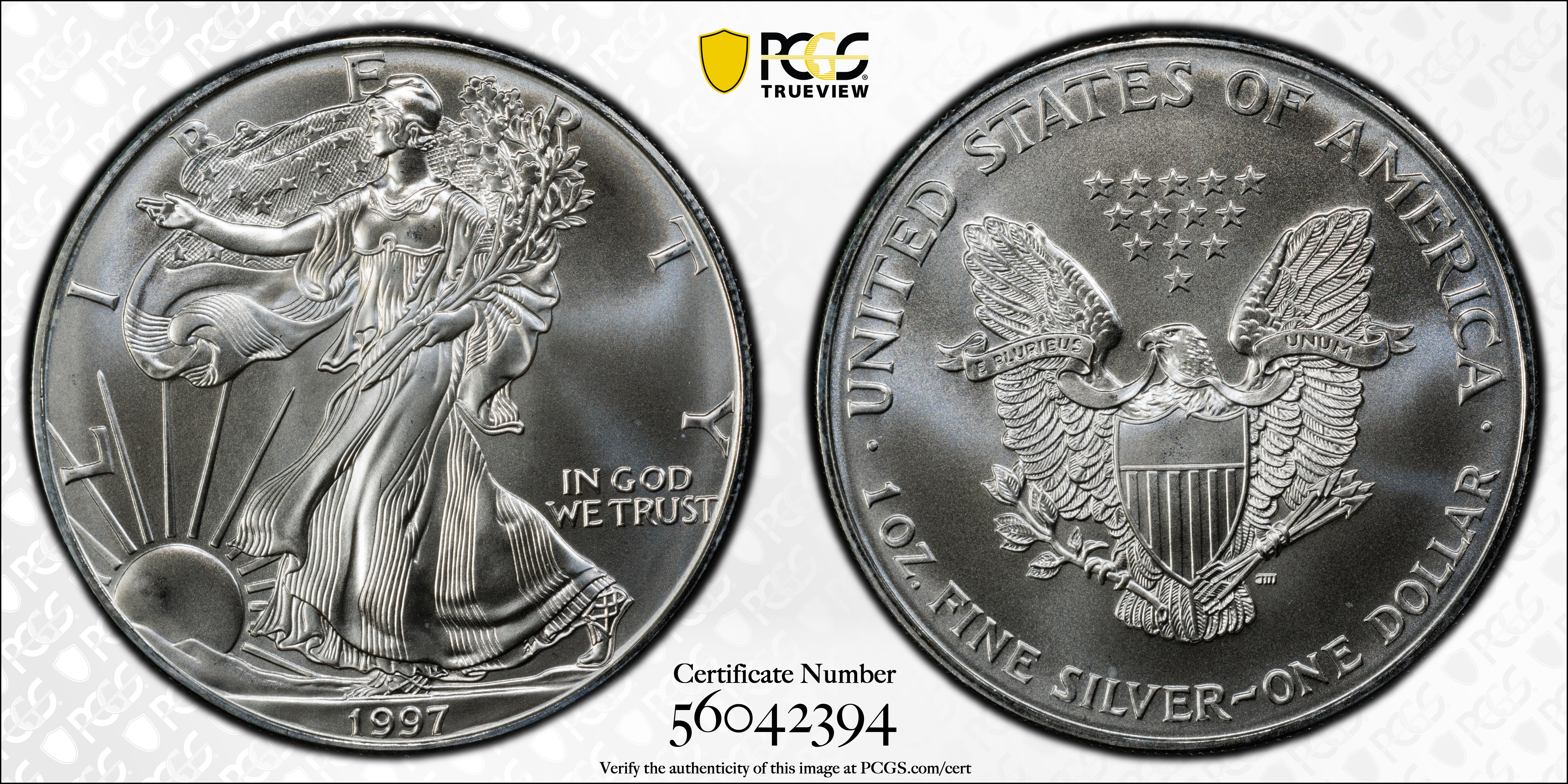1997 $1 Silver Eagle MS69 认证号56042394, PCGS号9912