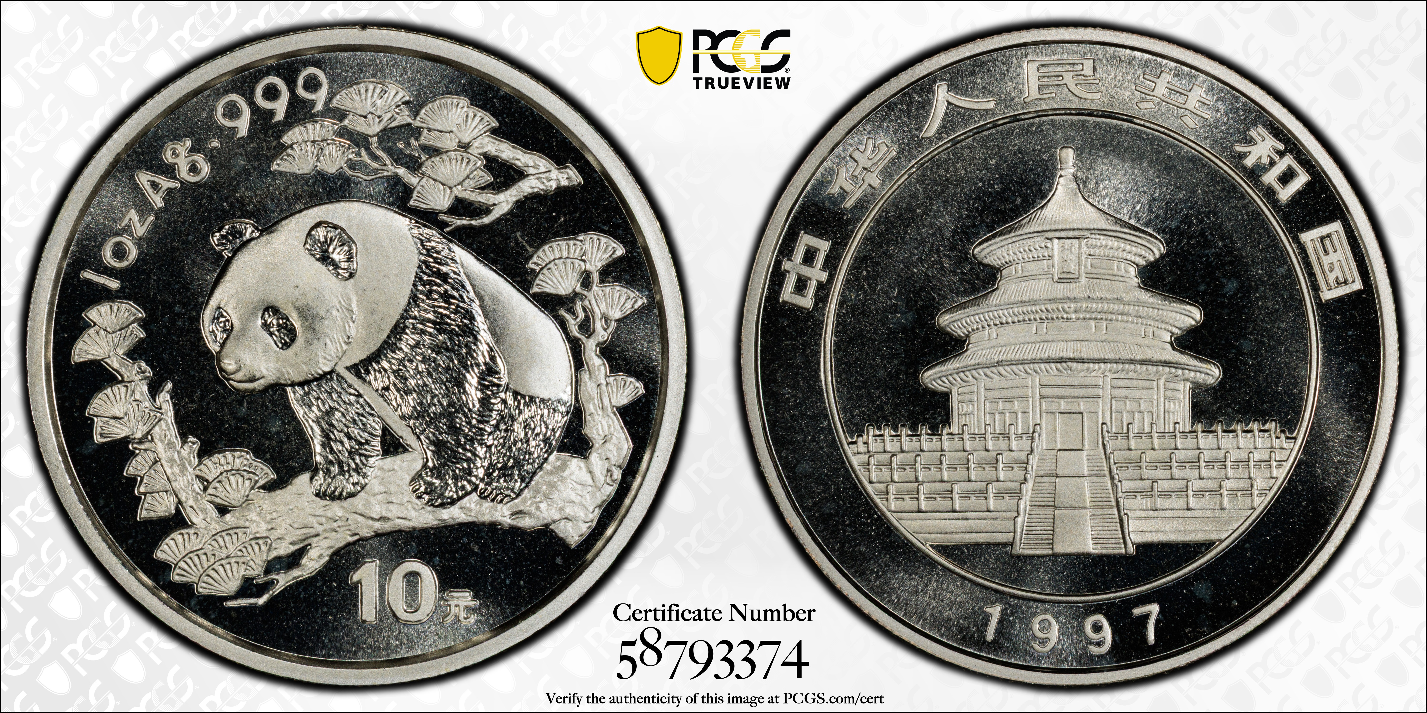 1997(沈) 10 Yn Panda Ag Large Date PAN-289B MS69 认证号58793374, PCGS号410634