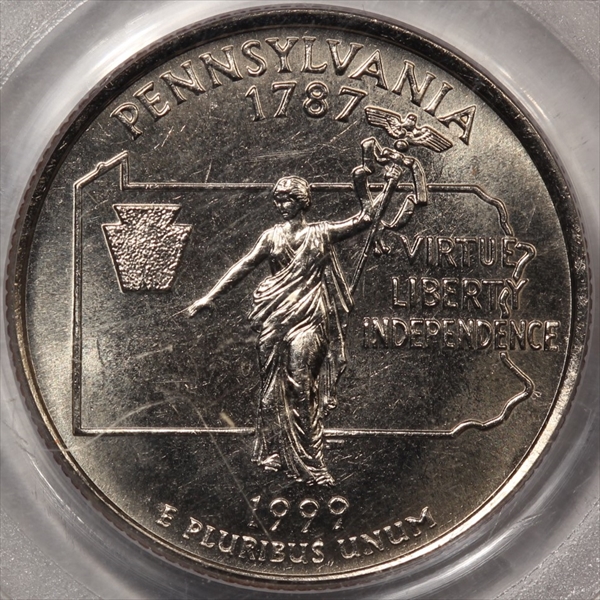 This is the first year in which the State Quarters were introduced by the U.S. Mint. In 1999 the Mint issued five different designs, with the Pennsylvania design being the second.