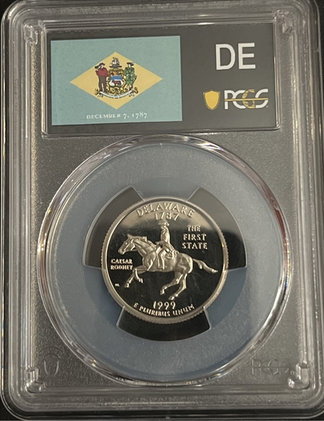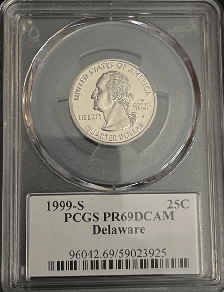 This is the first year of the very popular State Quarters Program. The program started in 1999 and honored each state with a quarter design, up until 2008 when the program was sucessfully completed. The 1999-S Delaware Proof Quarter is easily obtainable as it costs about a few dollars raw each. Only in PR70 Deep Cameo does it command a significant premium. Most examples appear to range from about PR67-PR69 Deep Cameo condition.