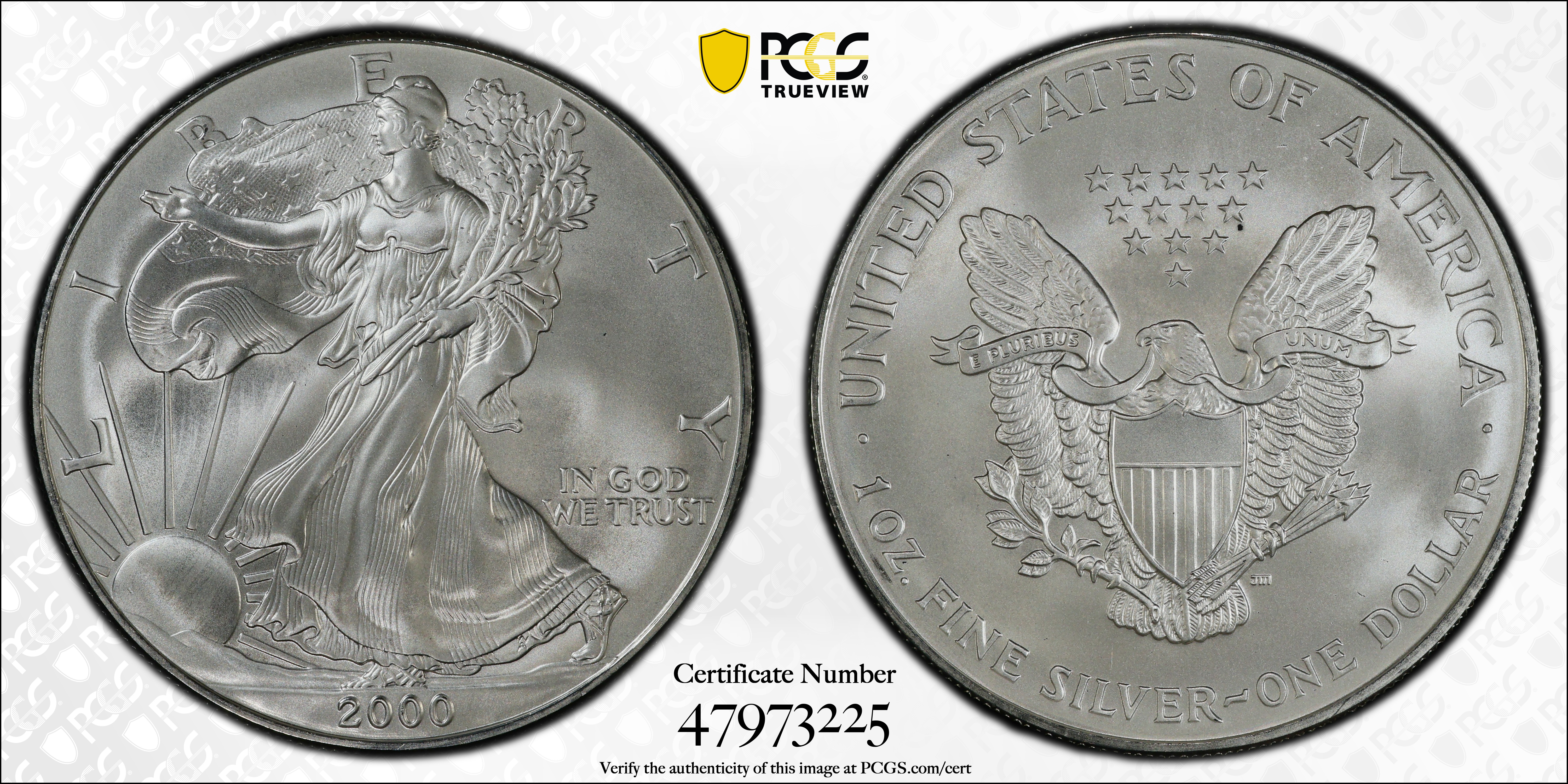 2000 $1 Silver Eagle MS70 认证号47973225, PCGS号9949