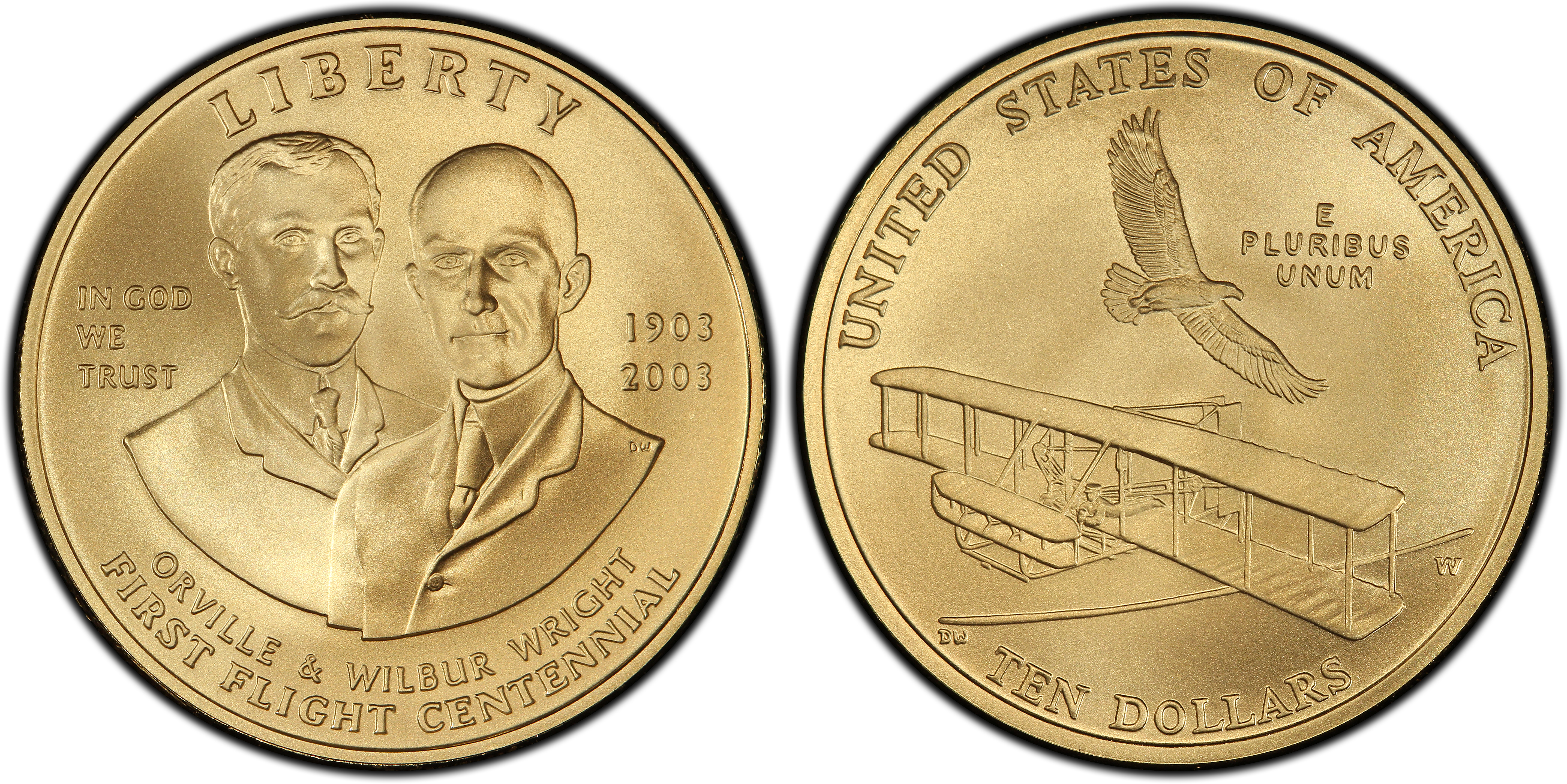 Reverse: The reverse of the coins shows the 1903 Flyer airplane. Above it is an eagle flying over the plane. It has the inscriptions, United States of America, E Pluribus Unum, Ten Dollars and the W mintmark.