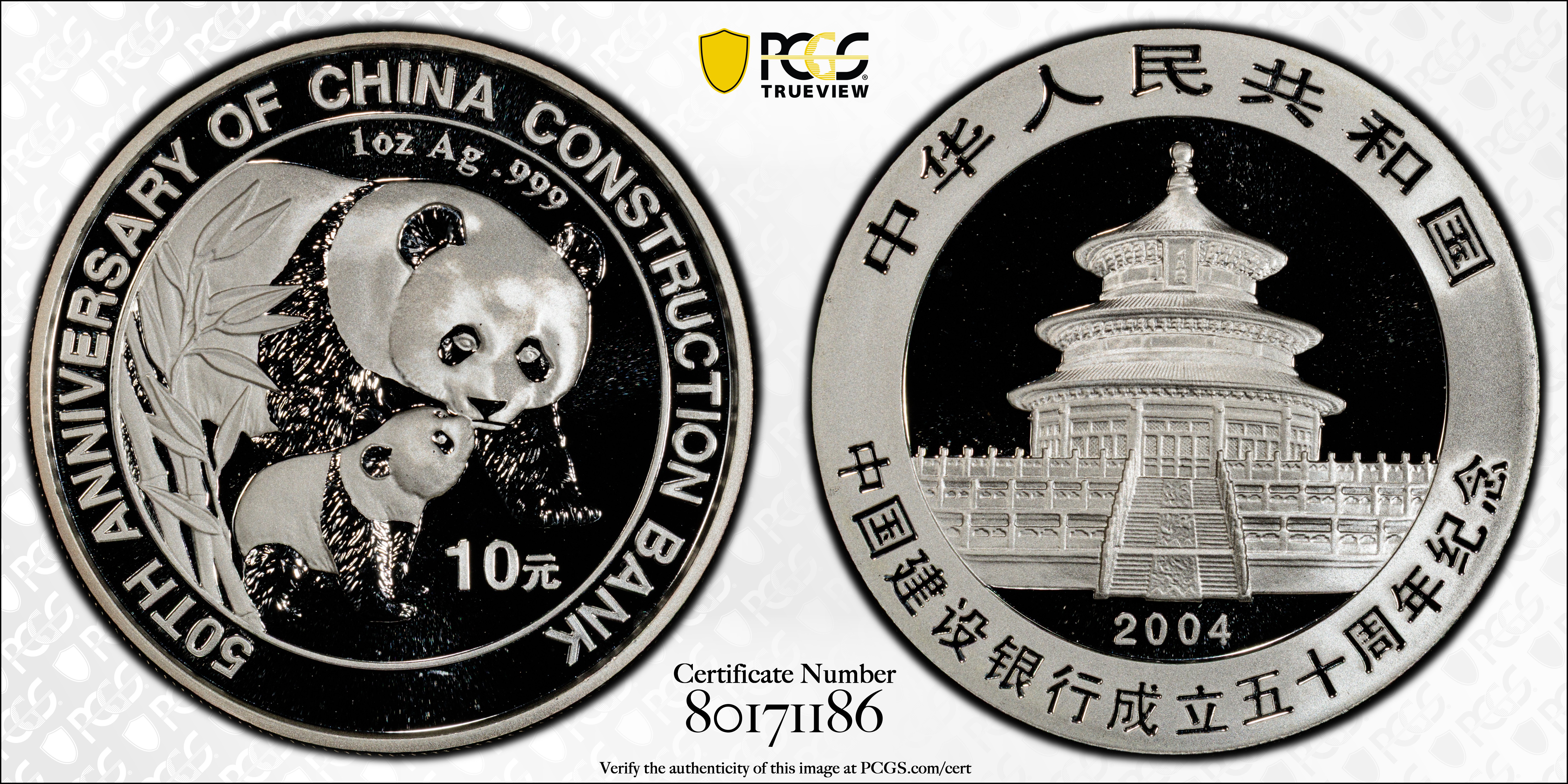 2004 10 Yn China Construction Bank PAN-385A MS70 认证号80171186, PCGS号404342