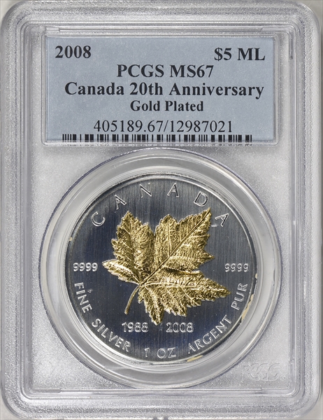 2008 $5 ML 20th Anniversary Gold Plated MS67 认证号12987021, PCGS号405189