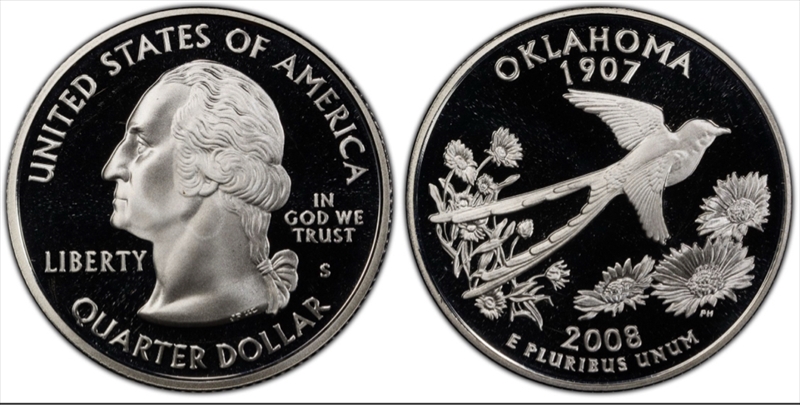 2008-S 25C Oklahoma Silver, DCAM PR70DCAM 认证号44973191, PCGS号39175