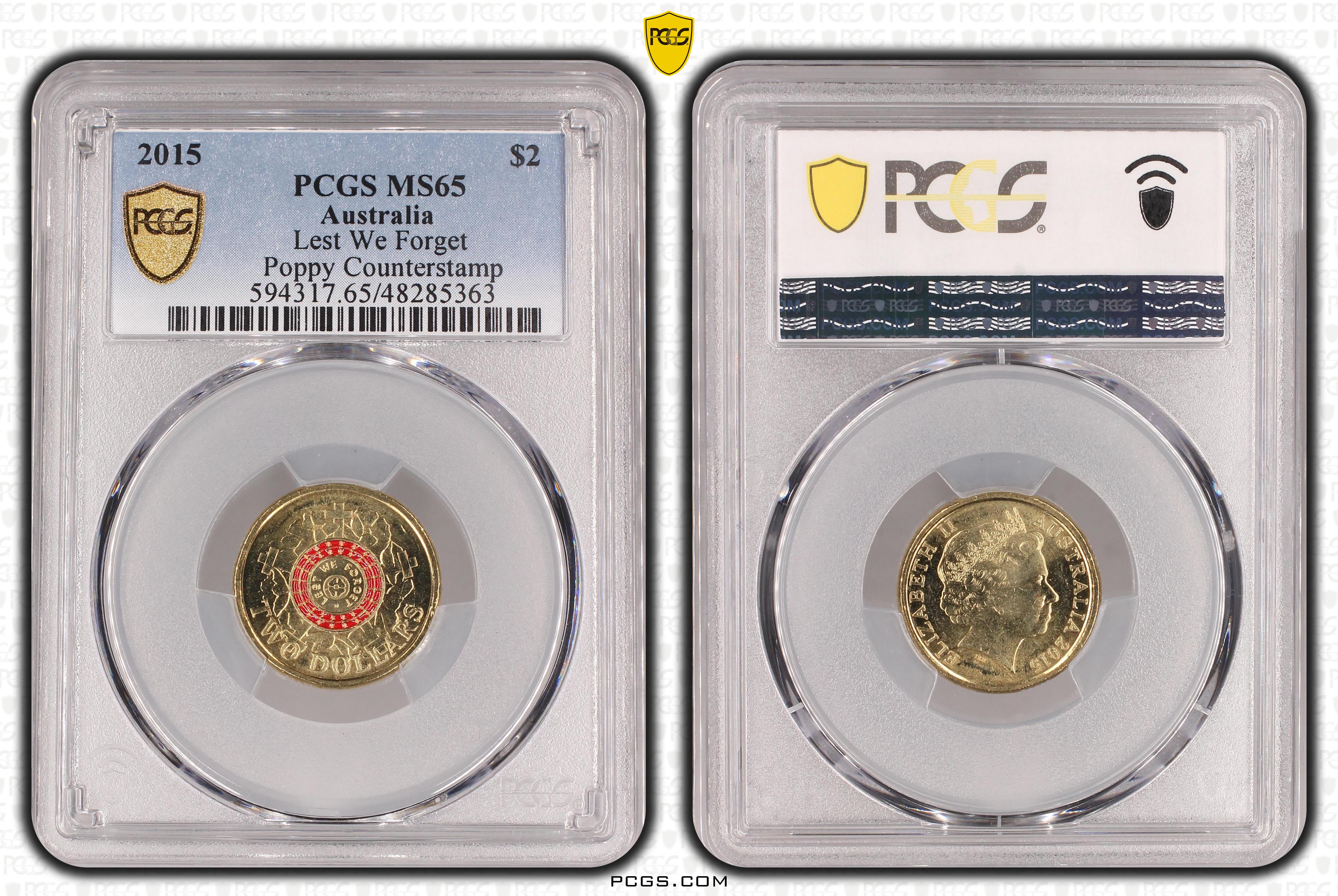 2015 $2 Lest We Forget Colorized Poppy Counterstamp MS65 认证号48285363, PCGS号594317