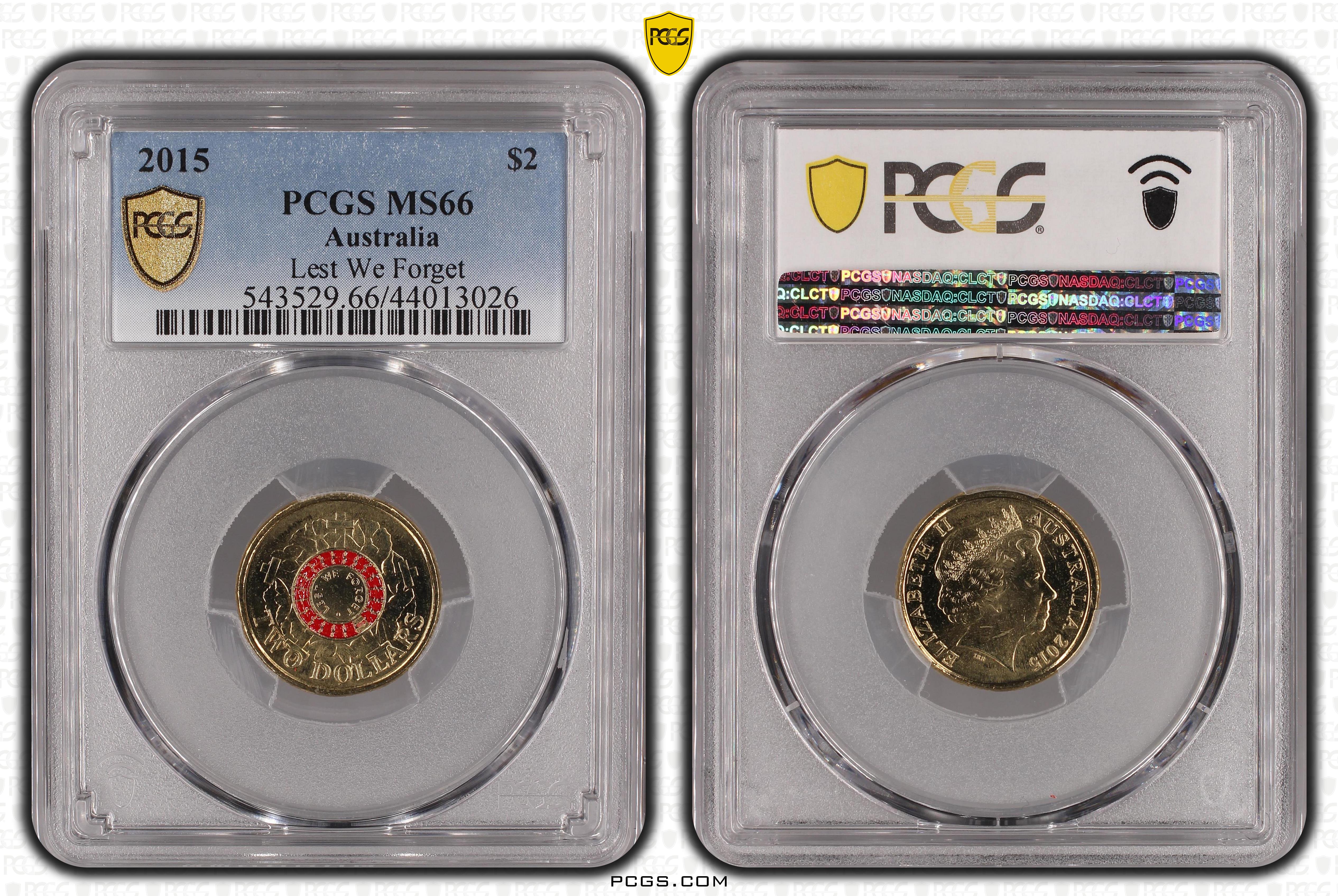 2015 $2 Lest We Forget Colorized MS66 认证号44013026, PCGS号543529