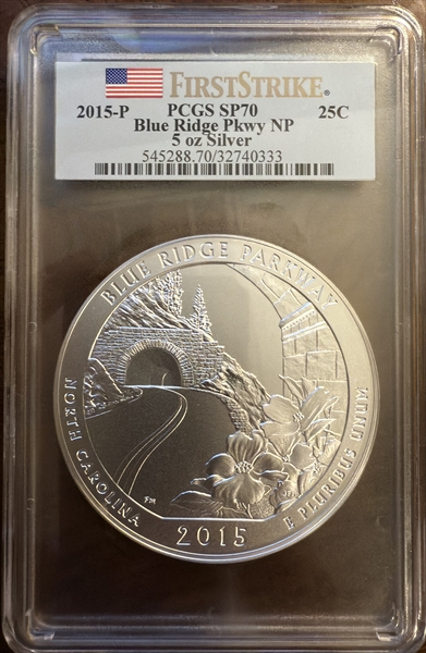 2015-P 25C Blue Ridge Pkwy NP 5 oz Silver First Strike SP70 认证号32740333, PCGS号545288