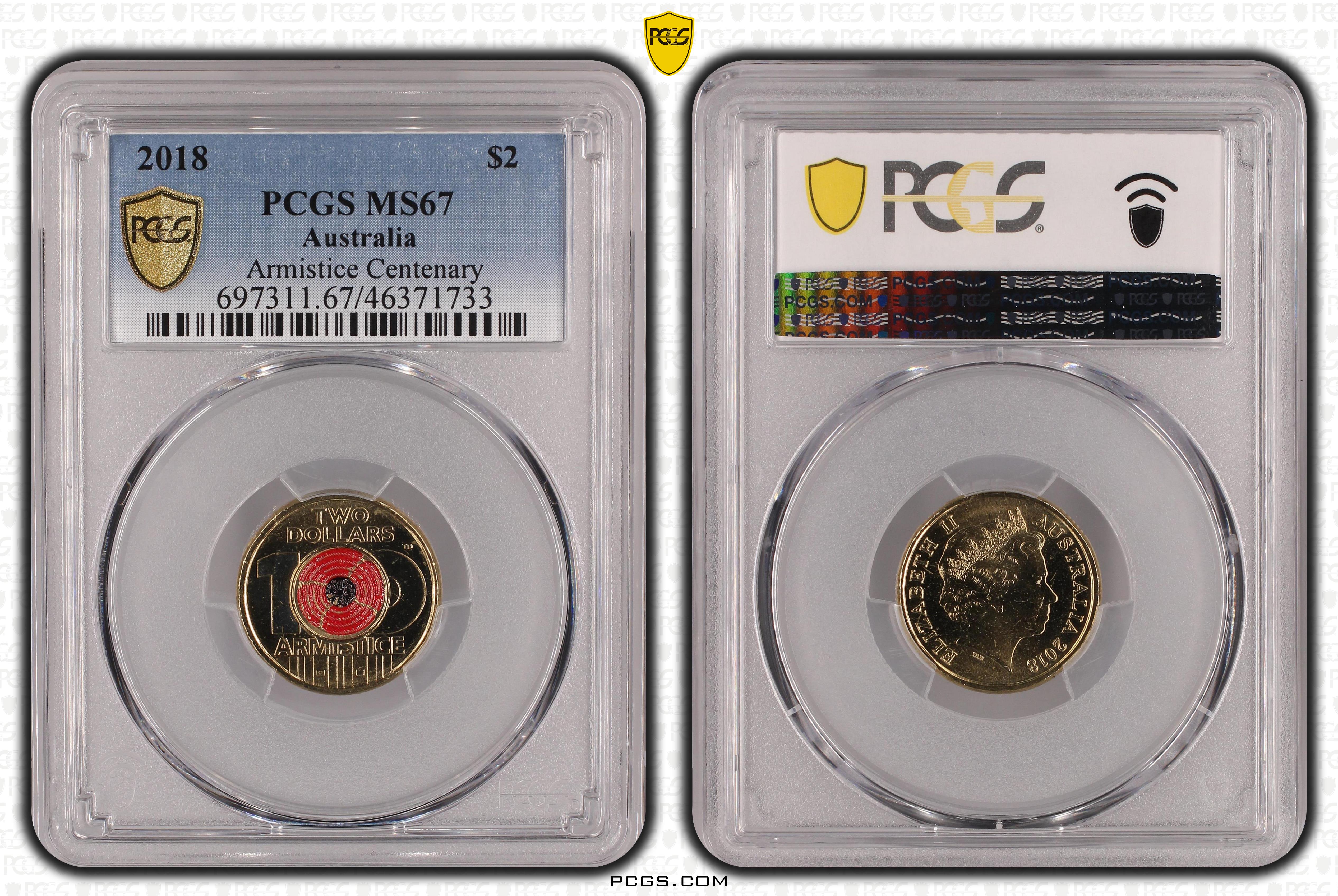2018 $2 Armistice Centenary Colorized MS67 认证号46371733, PCGS号697311