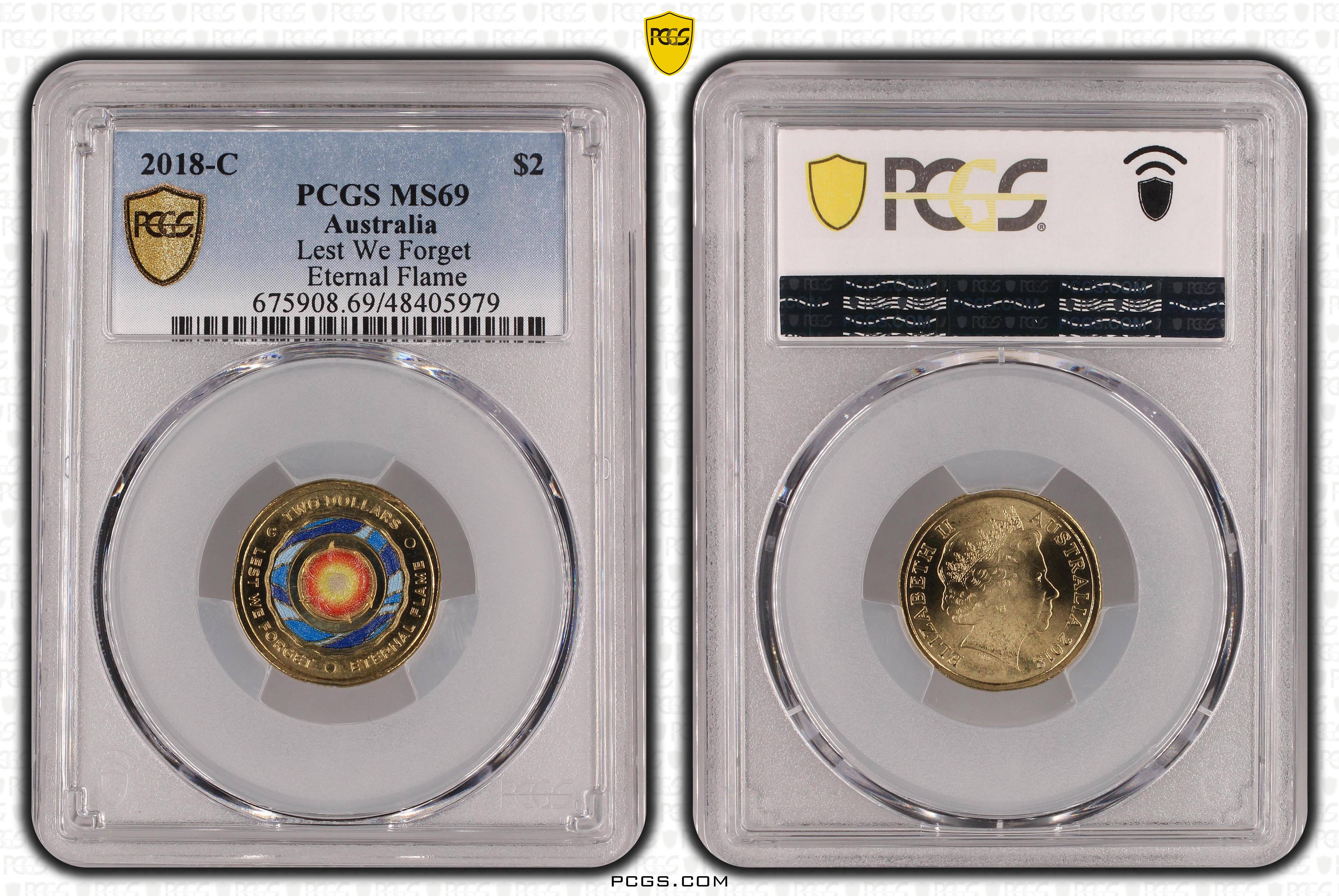 2018-C $2 Lest We Forget Eternal Flame Colorized MS69 认证号48405979, PCGS号675908