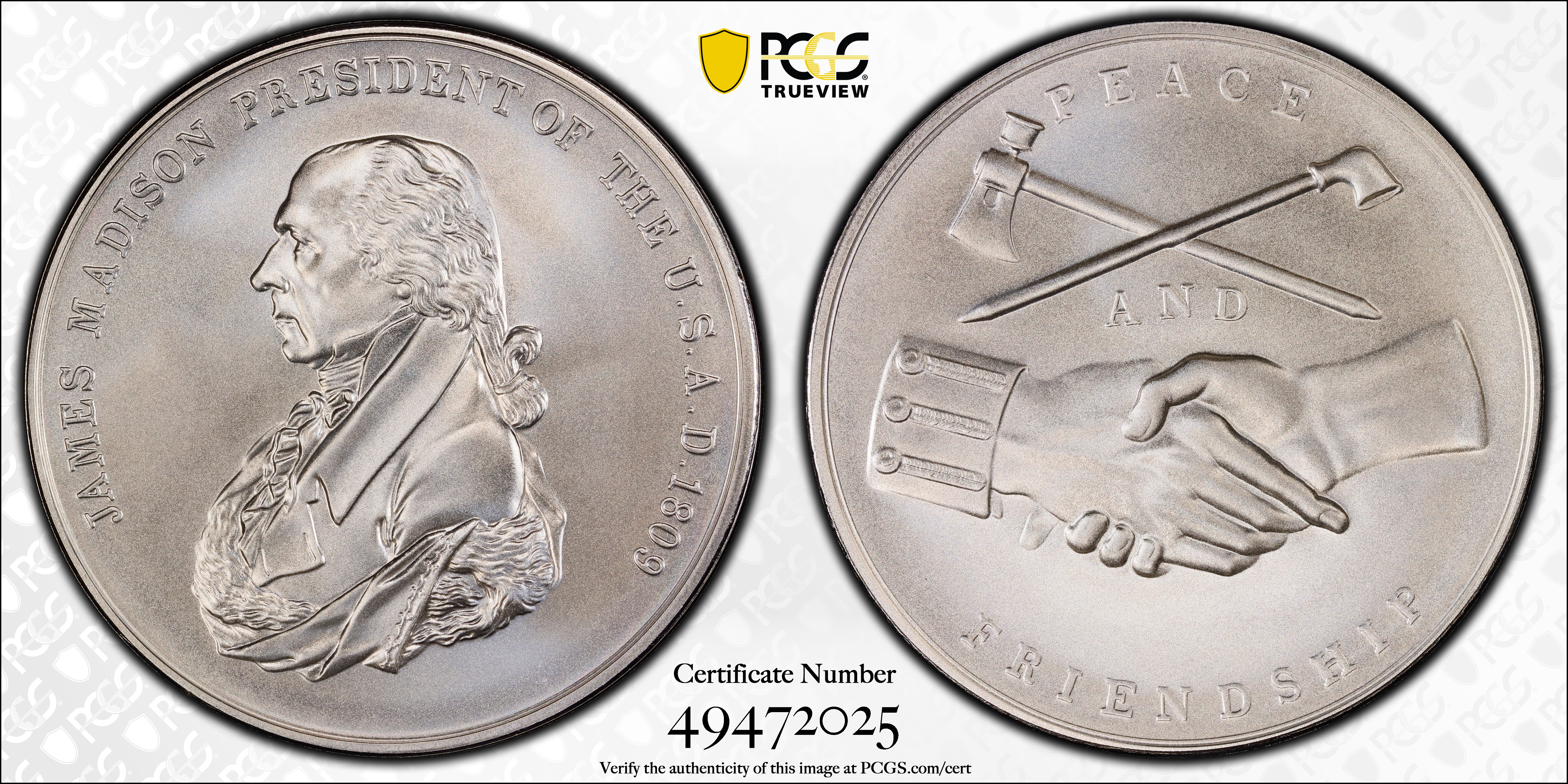 (2019) Medal James Madison "1809" Silver Matte Finish MS70 认证号49472025, PCGS号755404