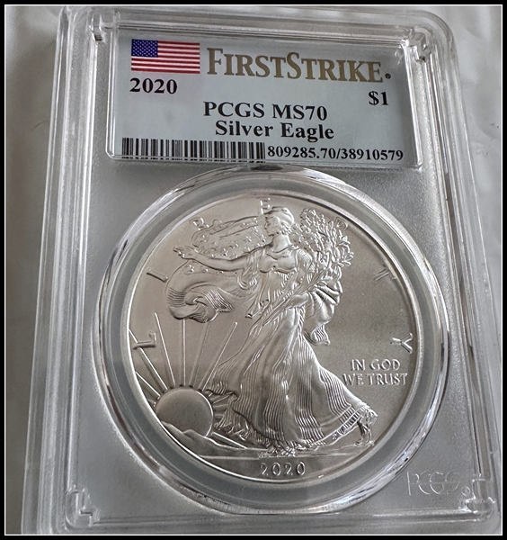 2020 $1 Silver Eagle First Strike MS70 认证号38910579, PCGS号809285