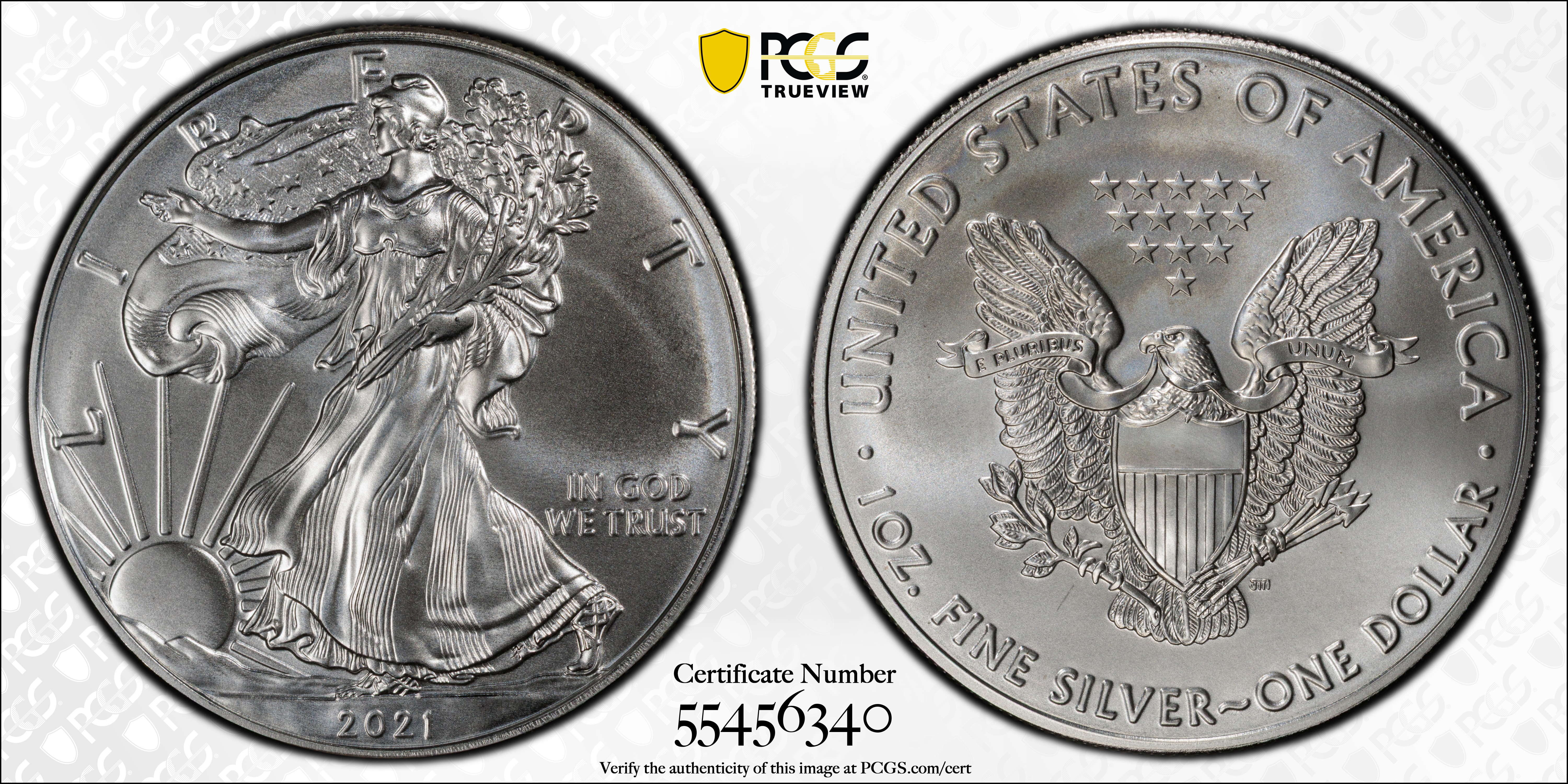 2021 $1 Silver Eagle - Type 1 MS69 认证号55456340, PCGS号837645