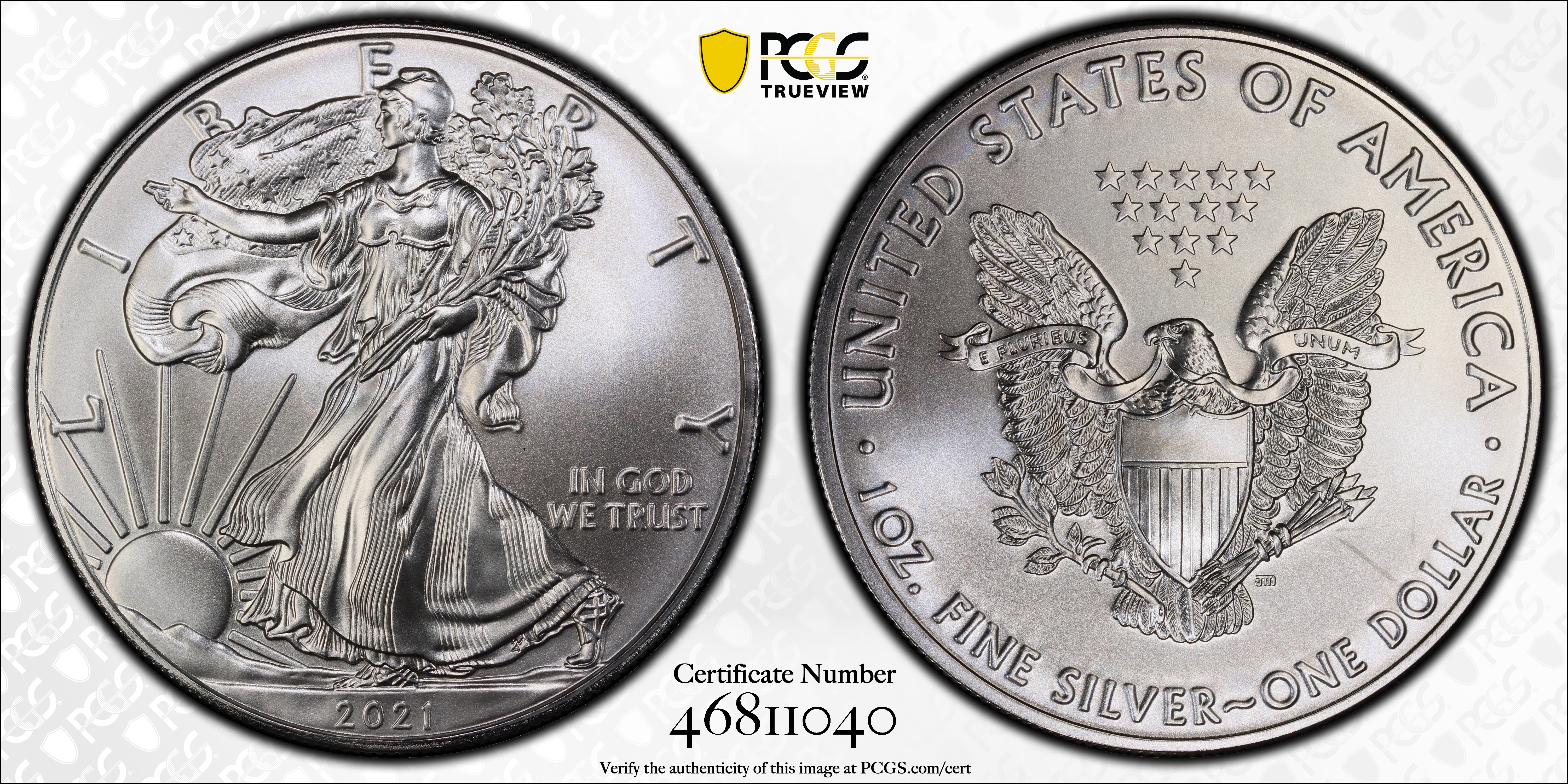 2021 $1 Silver Eagle - Type 1 MS69 认证号46811040, PCGS号837645