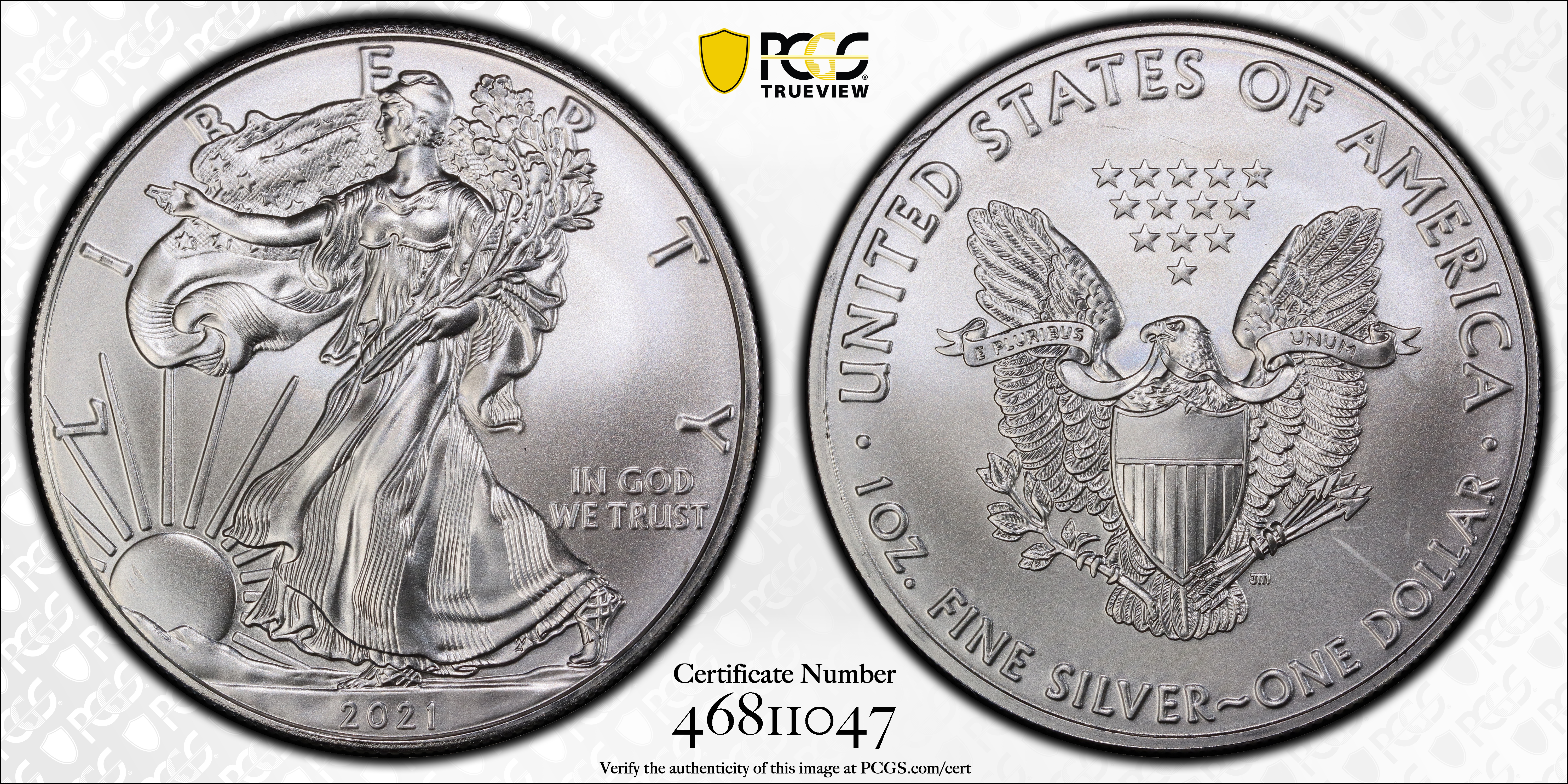 2021 $1 Silver Eagle - Type 1 MS69 认证号46811047, PCGS号837645