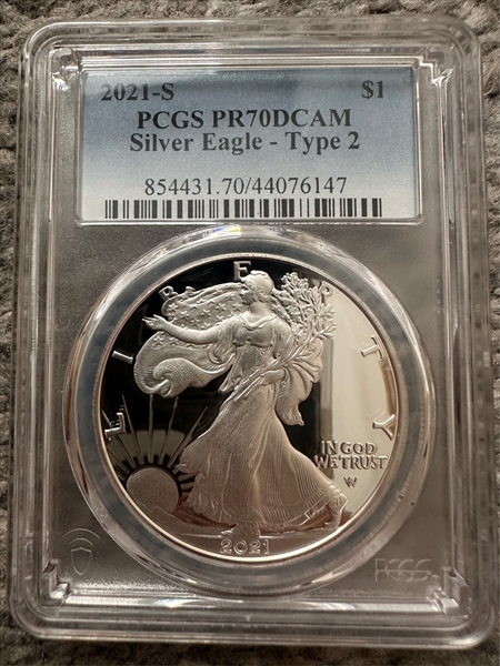 2021-S $1 Silver Eagle - Type 2, DCAM PR70DCAM 认证号44076147, PCGS号854431