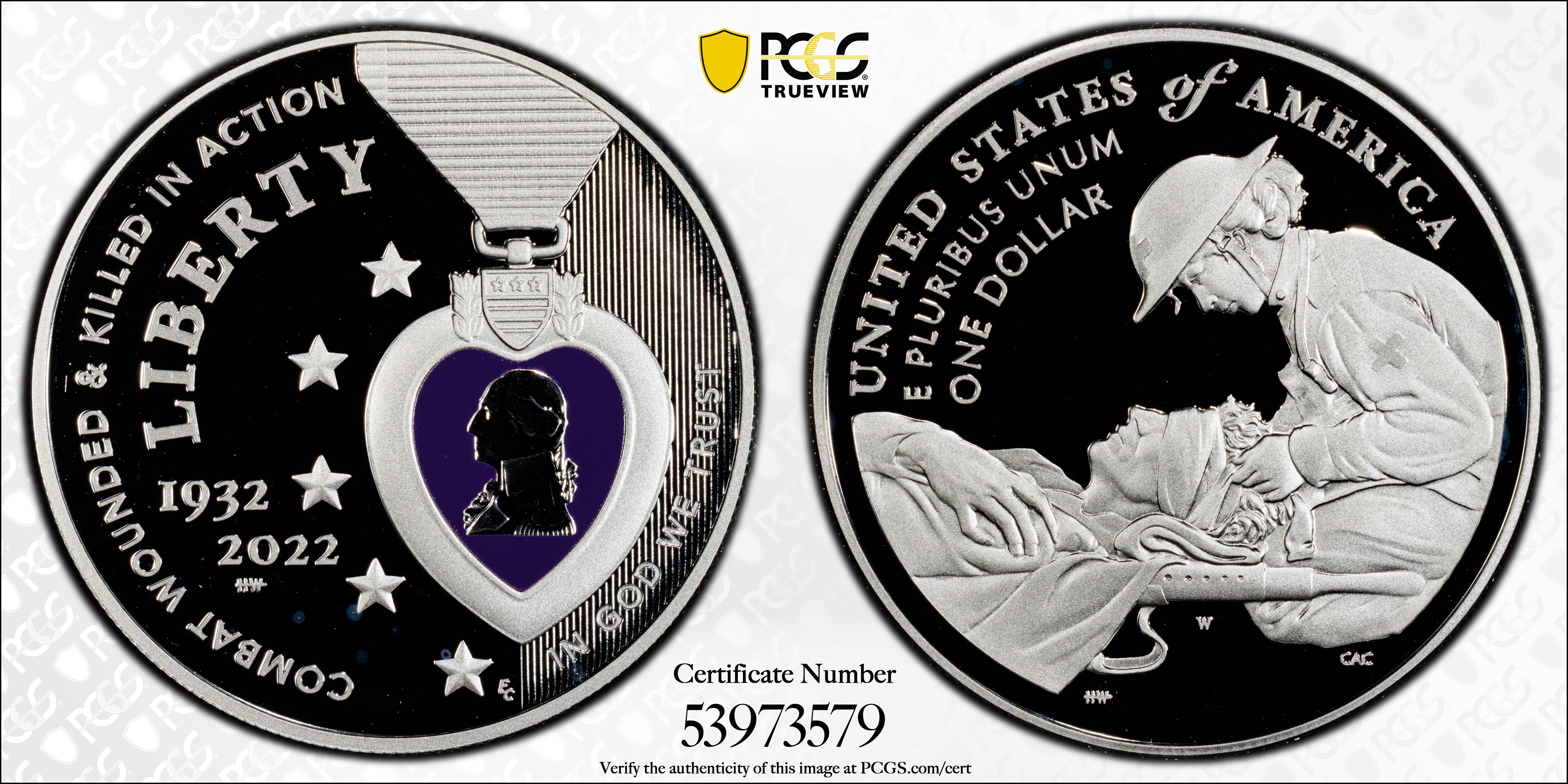 2022-W $1 National Purple Heart Hall of Honor Colorized, DCAM PR69DCAM 认证号53973579, PCGS号900707