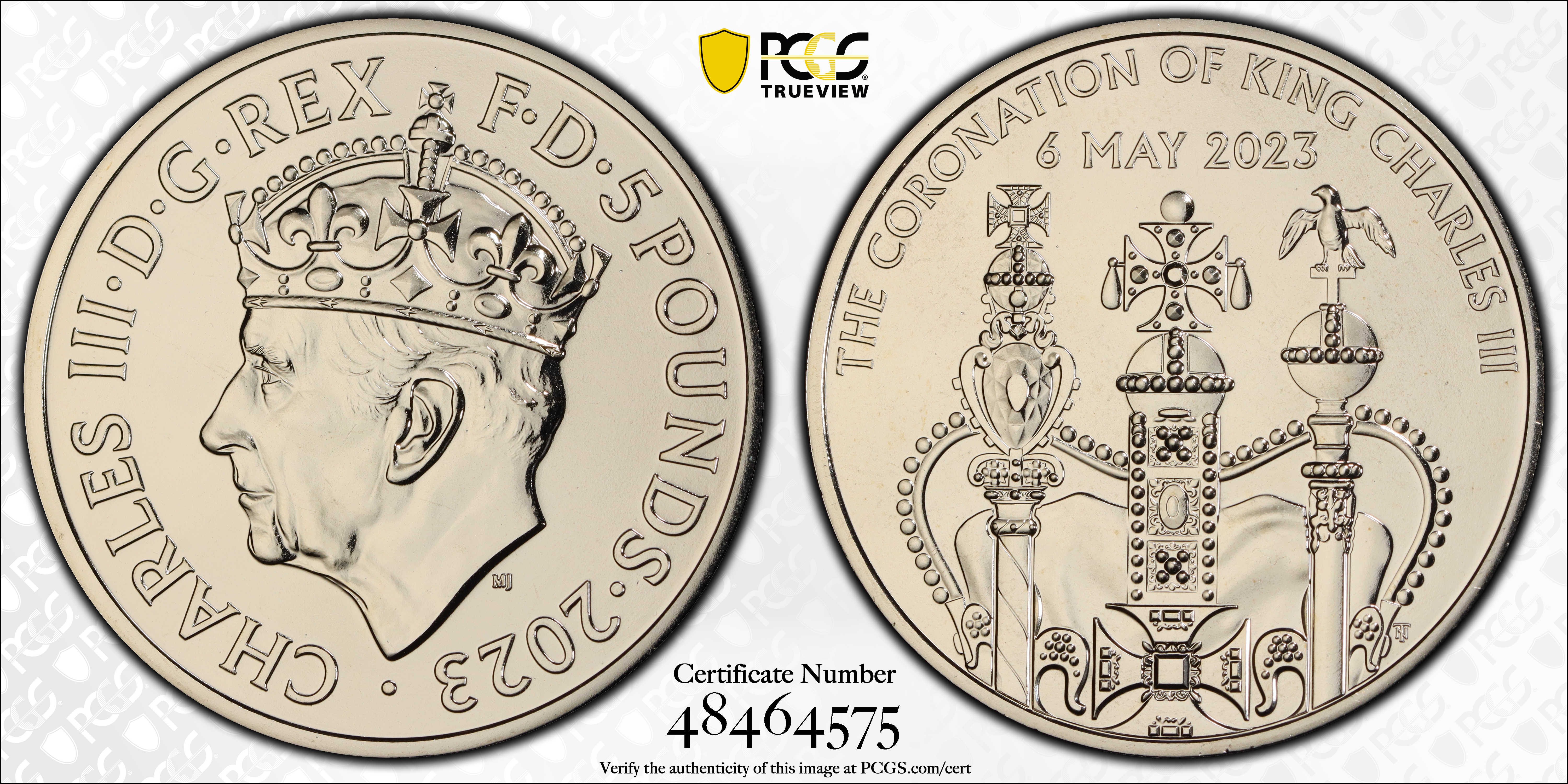 2023 £5 Coronation of Charles III CuNi MS69 认证号48464575, PCGS号924812