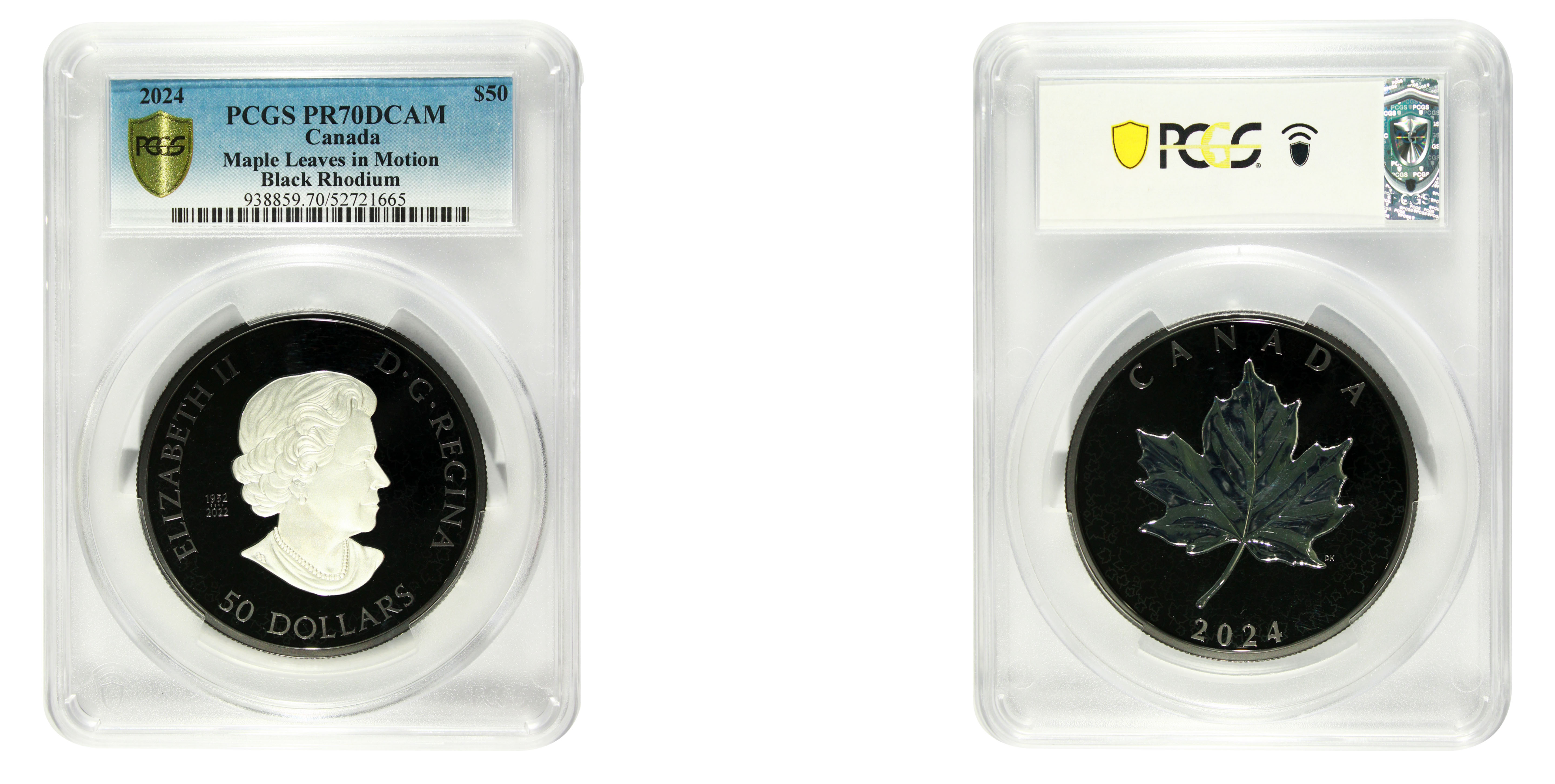 2024 $50 Maple Leaves in Motion Black Rhodium, DCAM PR70DCAM 认证号52721665, PCGS号938859