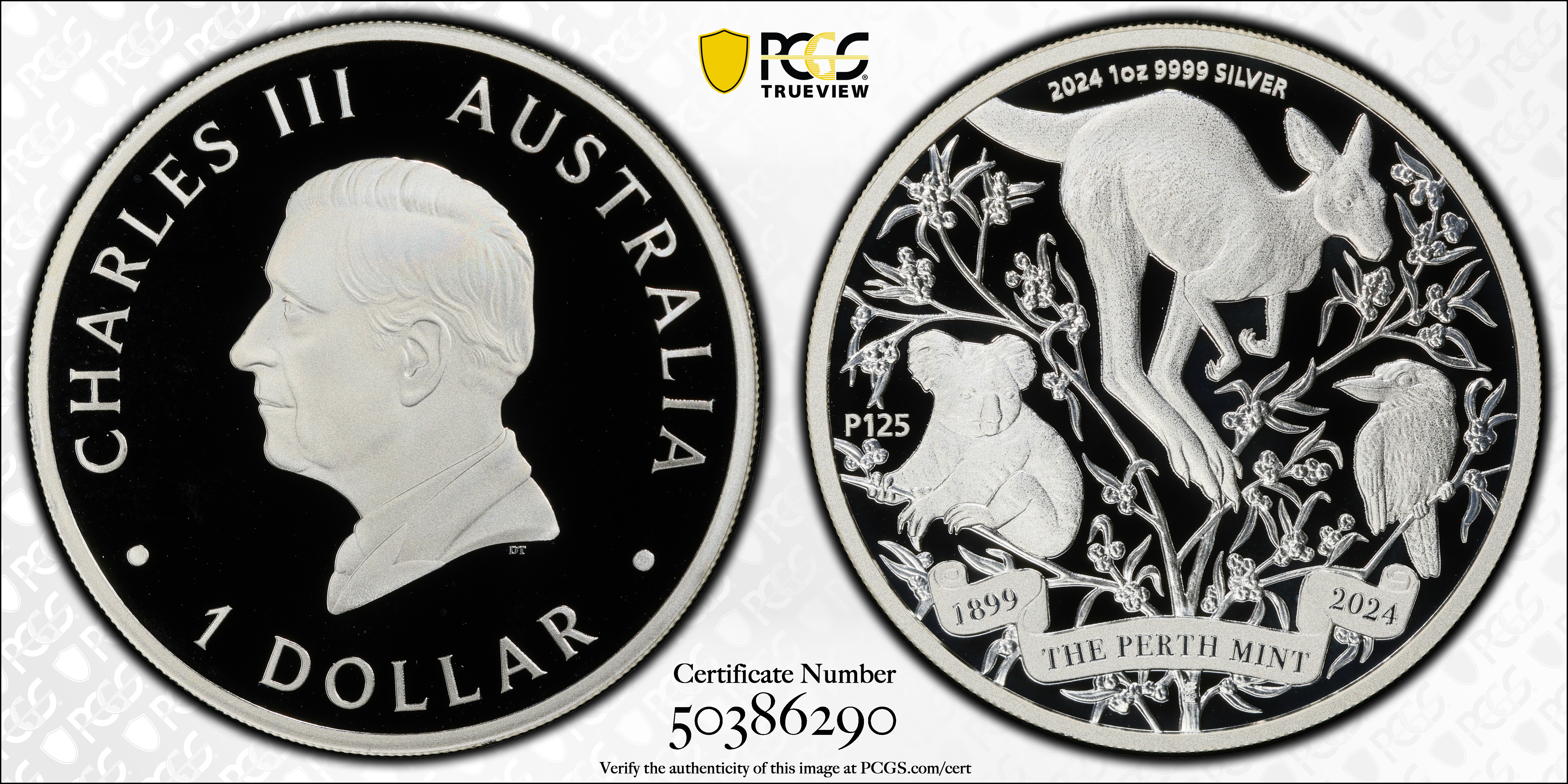 2024-P125 $1 Perth Mint 125th Anniv Ag, DCAM PR70DCAM 认证号50386290, PCGS号947114