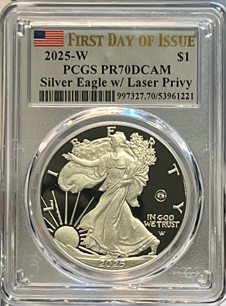 2025-W $1 Silver Eagle w/ Laser Privy First Day of Issue, DCAM PR70DCAM 认证号53961221, PCGS号997327