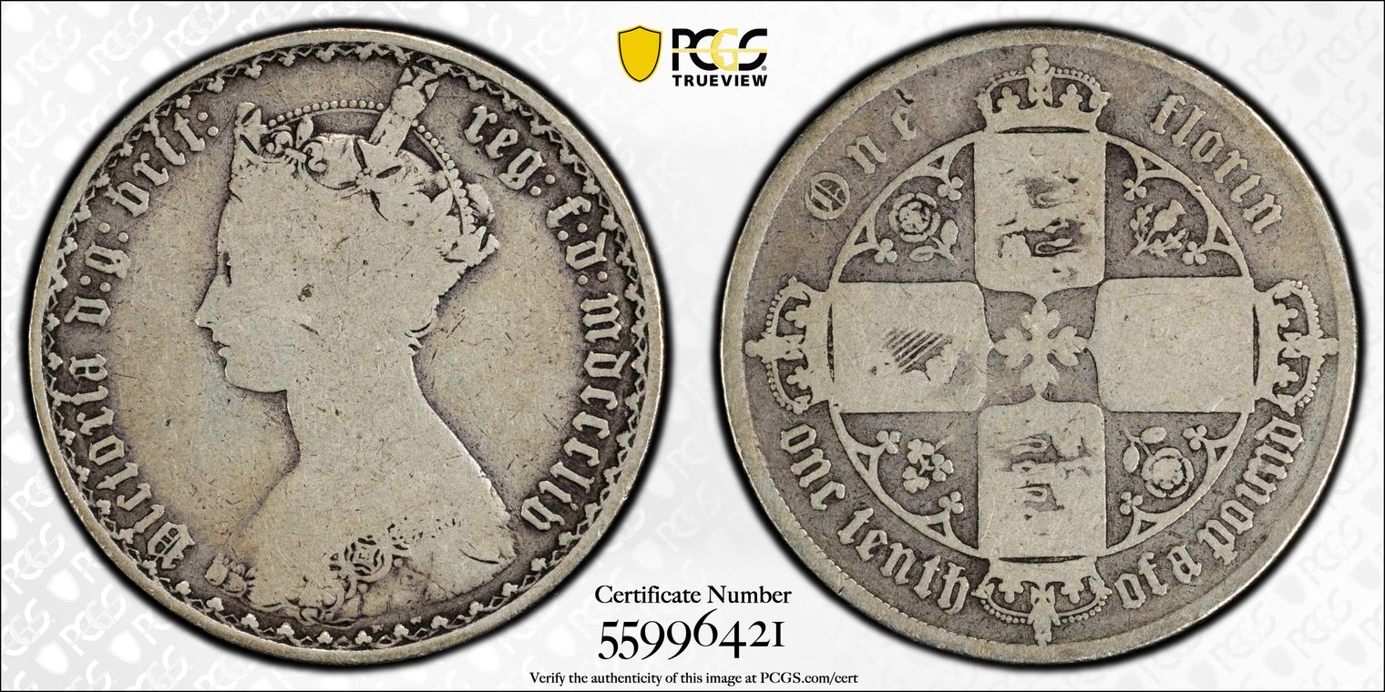 VICTORIA 1886 ‘GOTHIC HEAD’ FLORIN with beautiful original toning. Listed in SPINK as S3900 and ESC 863 (The English Silver Coinage From 1649) Rarity S Listed as B9 – Includes britt: and Queen Victoria has a 1mm larger head with hair plait further from the ear. Obverse depicts date in Gothic numerals (mdccclxxxvi) and no WW below the bust (the engraver William Wyon’s initials), with 34 small arc trefoils forming longer arcs and the reverse showing crowned cruciform shields; rose, thistle, rose and shamrock in angles engraved by W. Dyce. Maximum Die Number Unknown. SPINK’s 2011 catalogue values this at 475 GBP in UNC. PCGS Certificate No. 19128546 Graded MS-63
