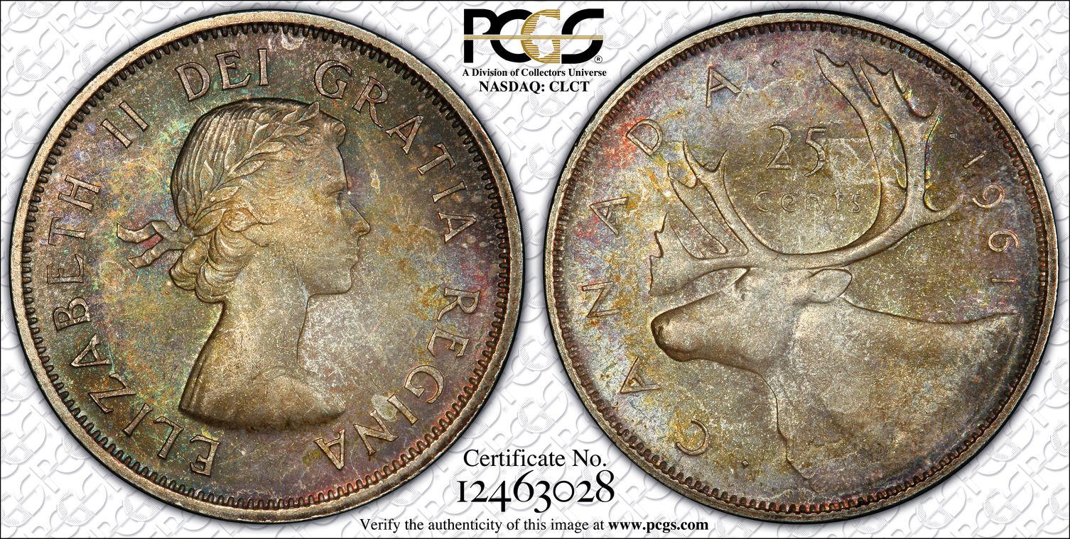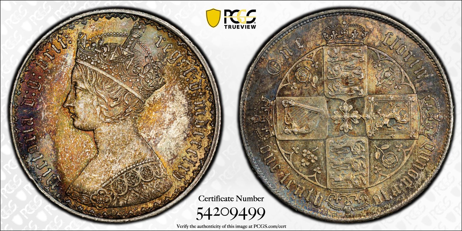 VICTORIA 1873 ‘GOTHIC HEAD’ FLORIN with dark green iridescent toning. Listed in SPINK as S3893 and ESC 841 (The English Silver Coinage From 1649) Rarity N Listed as B3 – Includes britt: and Queen Victoria has a more aquiline nose and different hair style. Obverse depicts date in Gothic numerals (mdccclxxvii) and WW below the bust (the engraver William Wyon’s initials) alongside die number 21, with 48 border trefoils and the reverse showing crowned cruciform shields and emblems in angles engraved by William Dyce. Maximum Die Number of 258 – Die Number 187 with an 8 over an upside-down 1, the 7 over an upside-down 6 or 8. SPINK’s 2011 catalogue values this at 500 GBP in UNC. PCGS Certificate No. 16155408 Graded MS-66 Ex: Cheshire Collection
