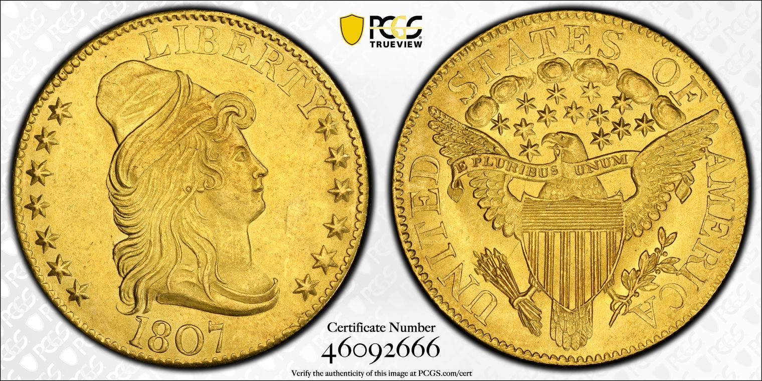 Breen-6459, B. 1-A, Miller-109, R.2. A canary-gold piece extensive bright luster and scant evidence of highpoint friction. A faint vertical pinscratch is in the left obverse field, otherwise an undisturbed and attractive example. Well struck aside from the rightmost portion of the horizontal shield lines. Along with the 1807, the 1810 Large Date, Large 5 is the most available variety of this desirable type and is often the candidate chosen for gold type sets.