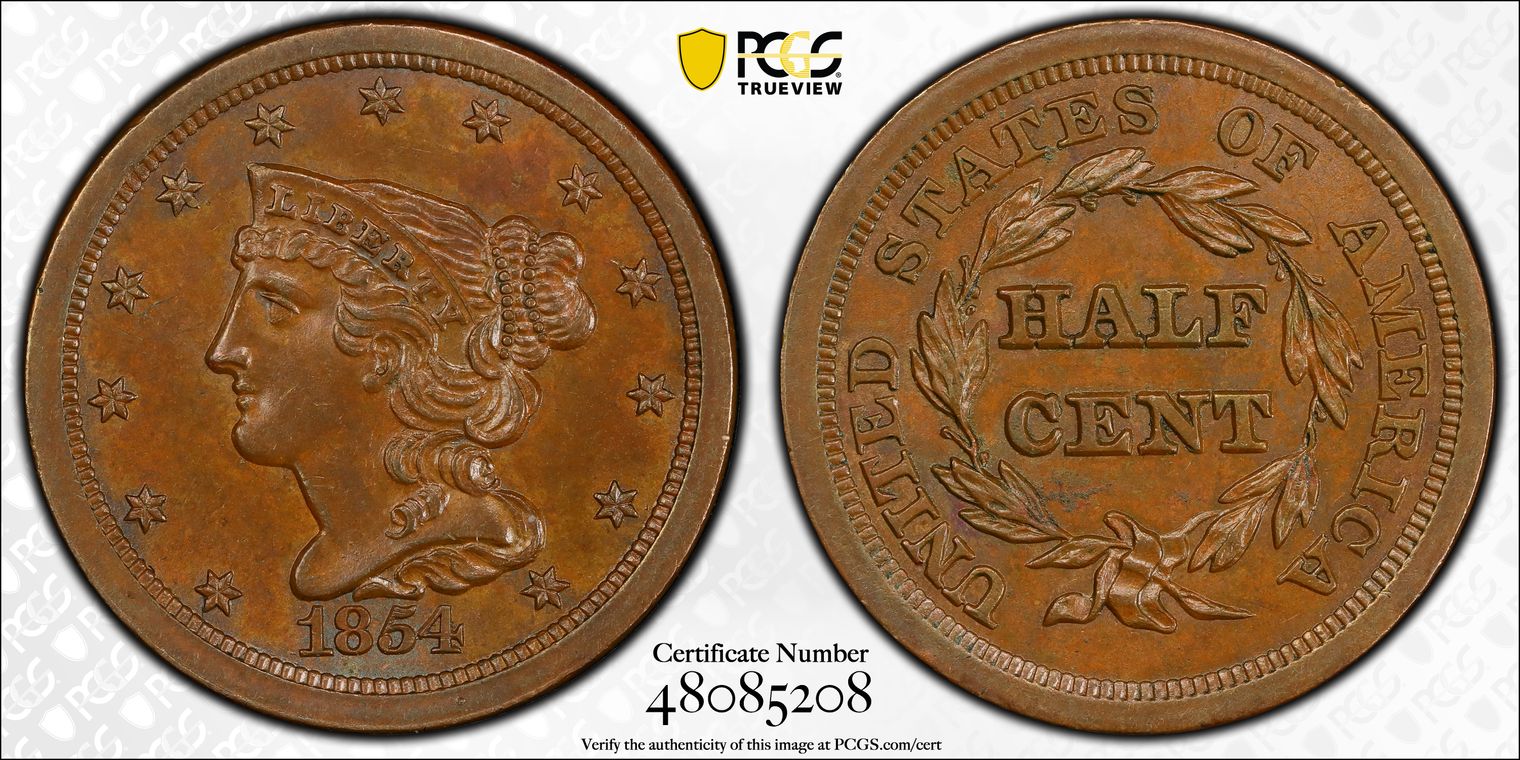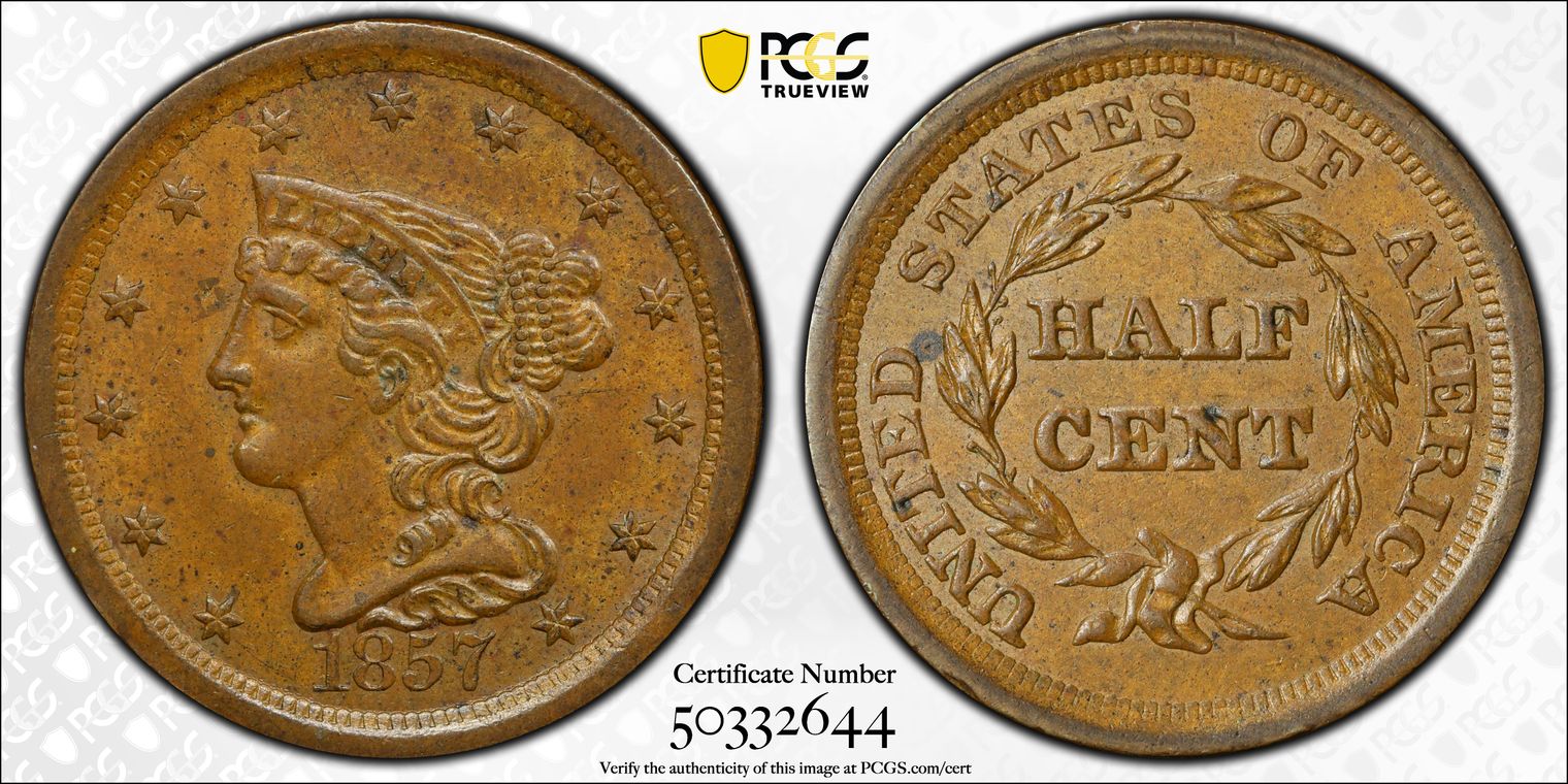 1857 Braided Hair Half Cent. C-1, the only known dies. Rarity-2. AU-55 (PCGS).