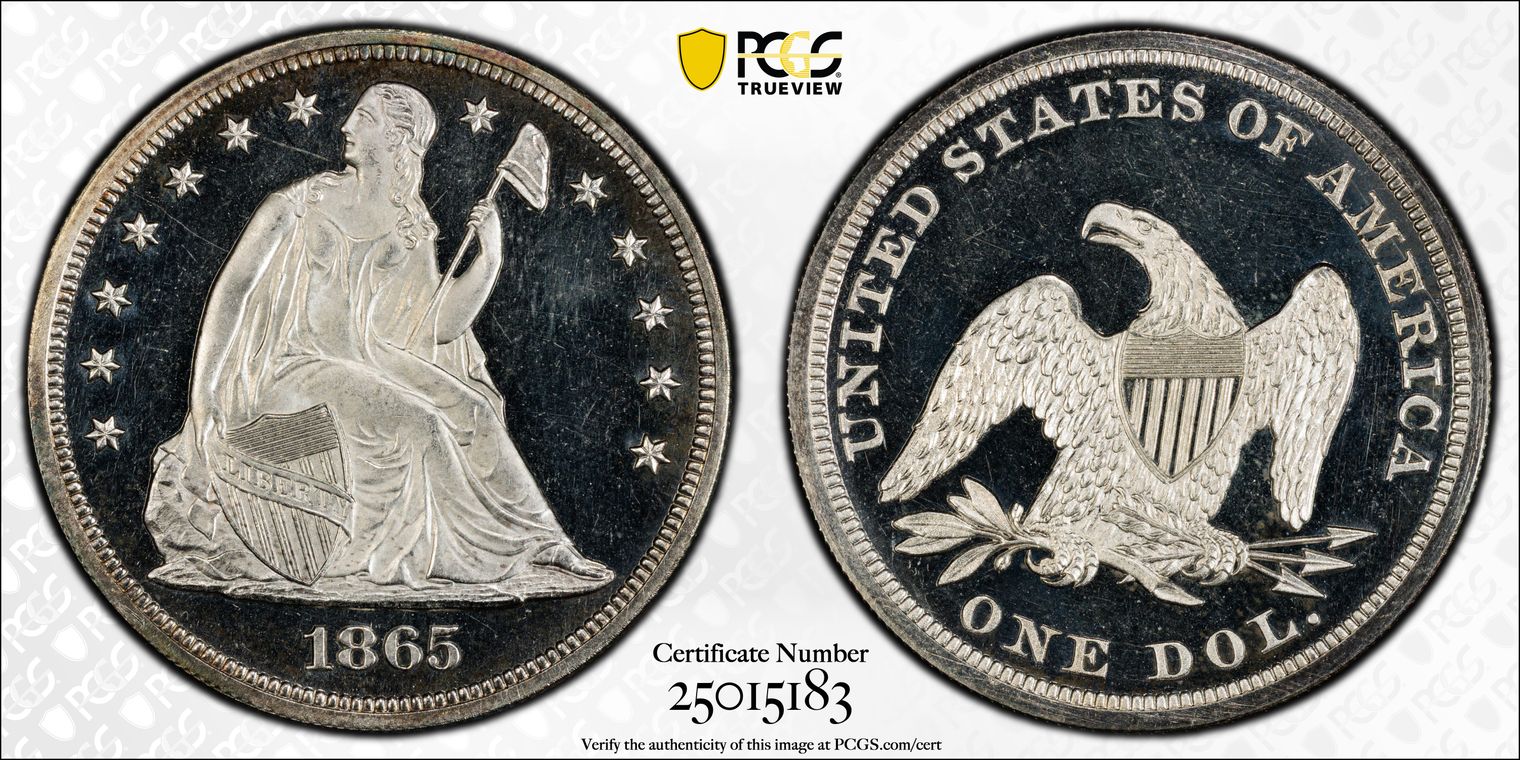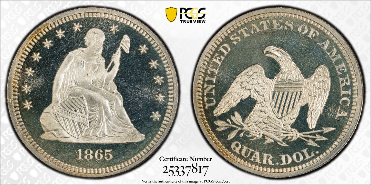 CAC - "This spectacular coin is the sole-finest 1874 Arrows proof quarter certified in either Cameo or Deep Cameo finish -- a high-end Superb Gem, with a pinpoint-sharp strike and the all-important PCGS Plus designation. Exquisite turquoise and russet-tan toning decorates each side, suggesting original proof set color."