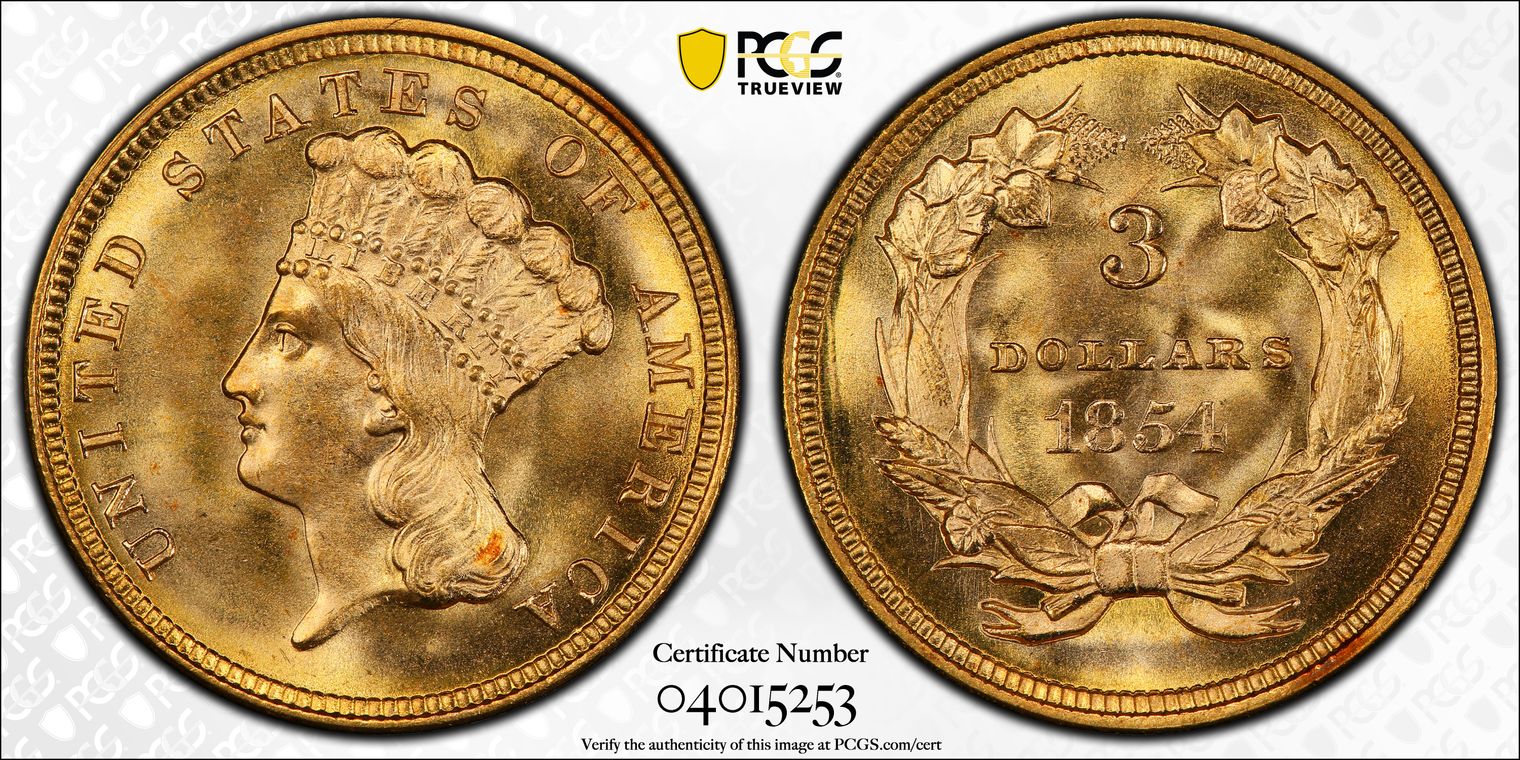 CAC - Lustrous and satiny example of this tremendous condition rarity in the three-dollar gold series. The strike is sharp throughout, with strong definition to Liberty's hair and the reverse wreath. Pristine surfaces and exceptional eye appeal