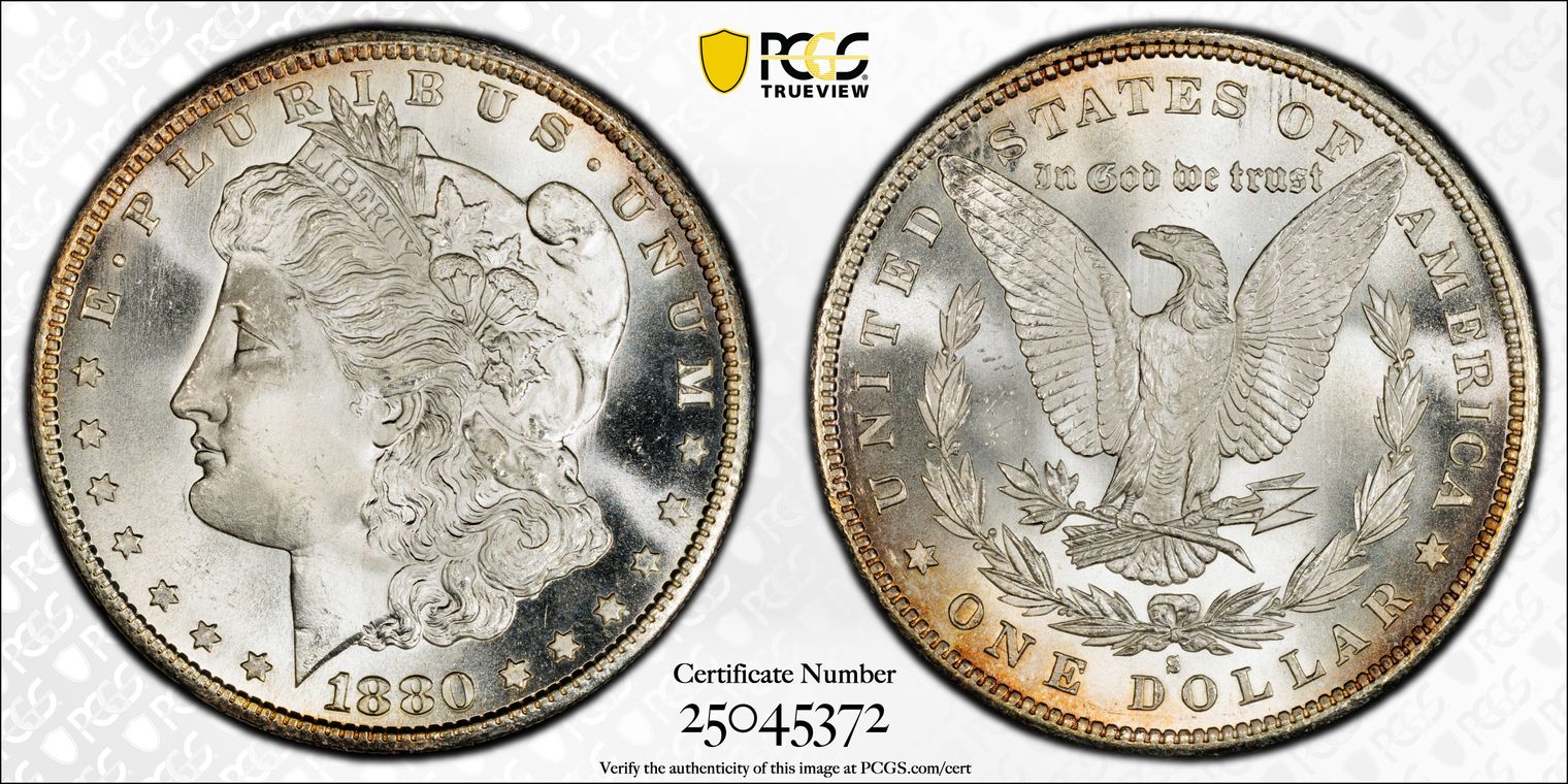 This superb GEM example is tied for finest graded for the date. A rich satiny mint frost swirls on both sides of this smooth as glass example. The devices on the obverse and reverse are very well struck and exceptionally well defined. A dusting of delicate clear gold toning on both sides. The surfaces are clean and smooth, free of any distractions.