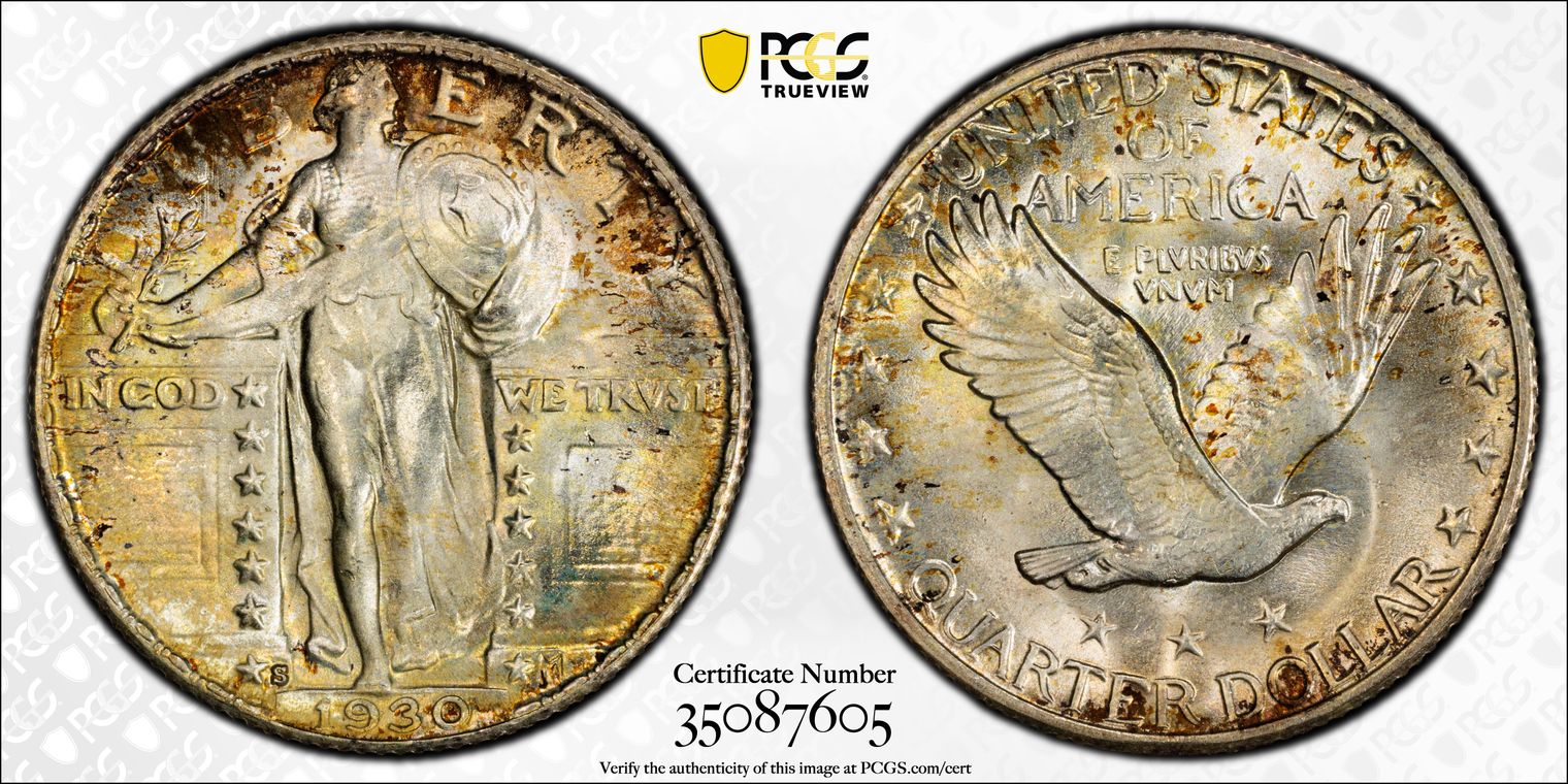 CAC - The only MS68 Type I Standing Liberty Quarter Endorsed by CAC. The detail is excellent, not only on Liberty's head but on the small feathers of the eagle. Strong mint luster swirls beneath deep and gorgeous patina, which covers the surfaces in patches of peach-umber, green-gold, and muted powder-blue.