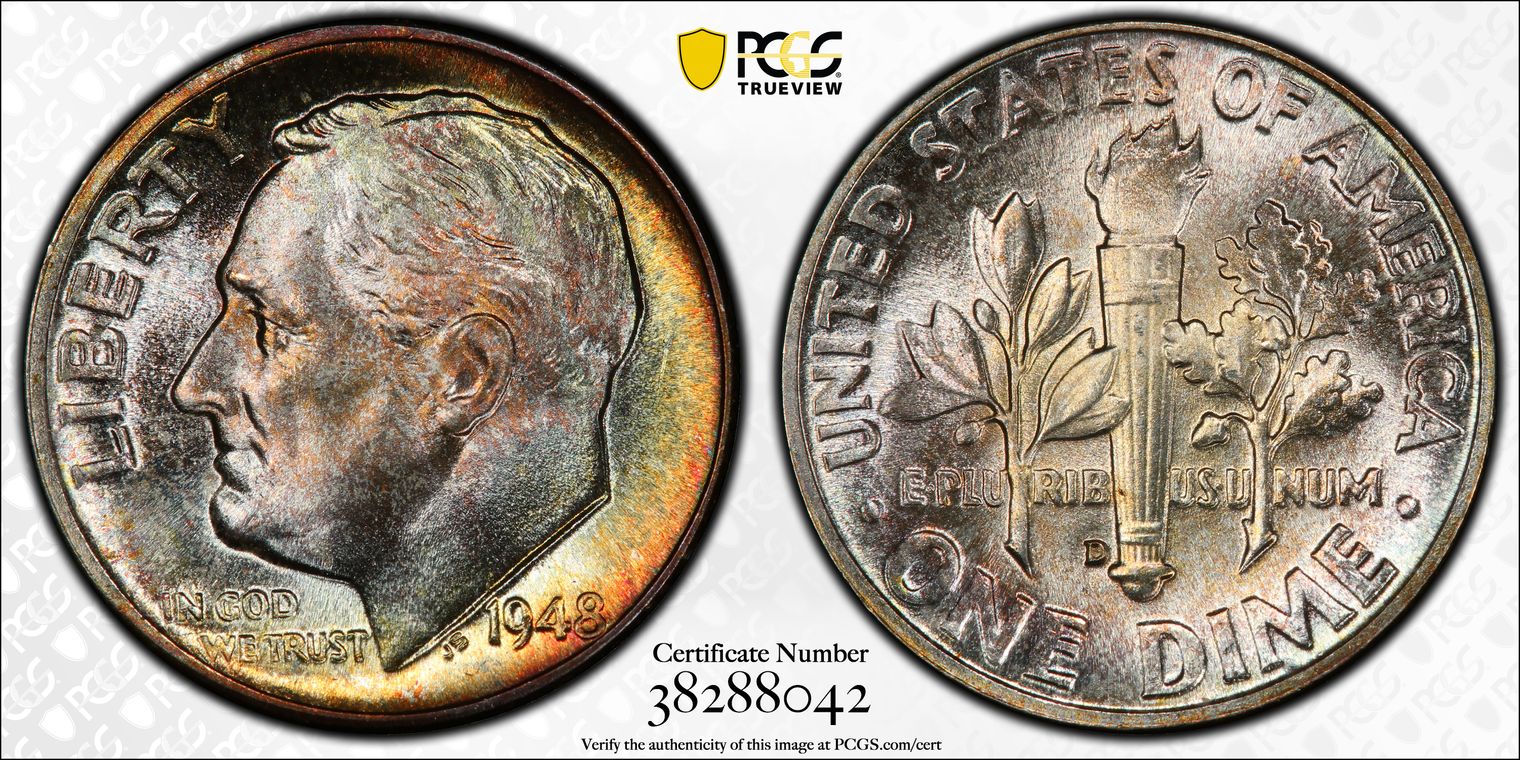 CAC- "A superb gem, this 1912-S Barber 10c retains its full, original luster with a strong cartwheel visible under vivid multi-colored toning. Pastel green, magenta, and pale blue are dominant, with russet and olive more visible on the reverse. Boldly struck, with all of the finest details exhibited in strong relief, and surfaces that show only the most trivial disturbance under strong magnification, this MS67+ closely approaches the MS68 grade. The finest 1912-S at PCGS (4/24) Ex. Law Collection, Simpson, Stewart Blay.
