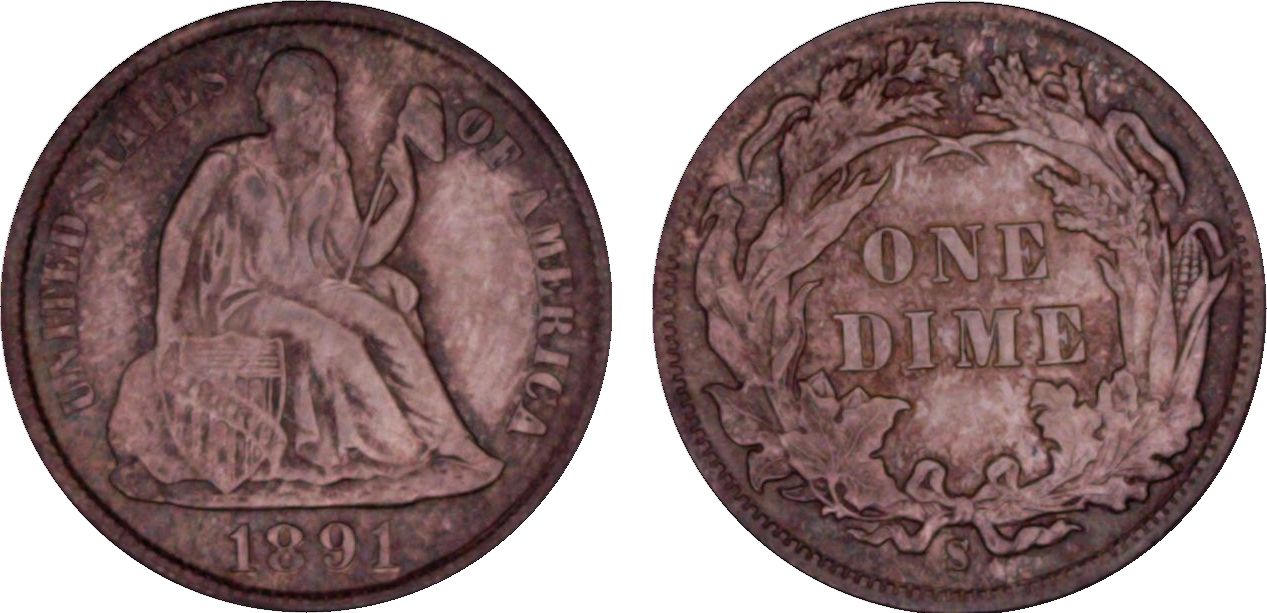 CAC.The austere elegance of Christian Gobrecht's No Stars dime design--Liberty seated against a plain background on the obverse with date below, the reverse with UNITED STATES OF AMERICA around a simple wreath with ONE / DIME inside--makes it one of the simplest but also one of the most classically beautiful 19th century coinage designs. This lustrous, softly frosted Gem offers great eye appeal thanks to broad strokes of blue, violet, green, gold, and orange patina that leave only a few windows of original silver. Population: 25 in 65, 7 finer (11/10)