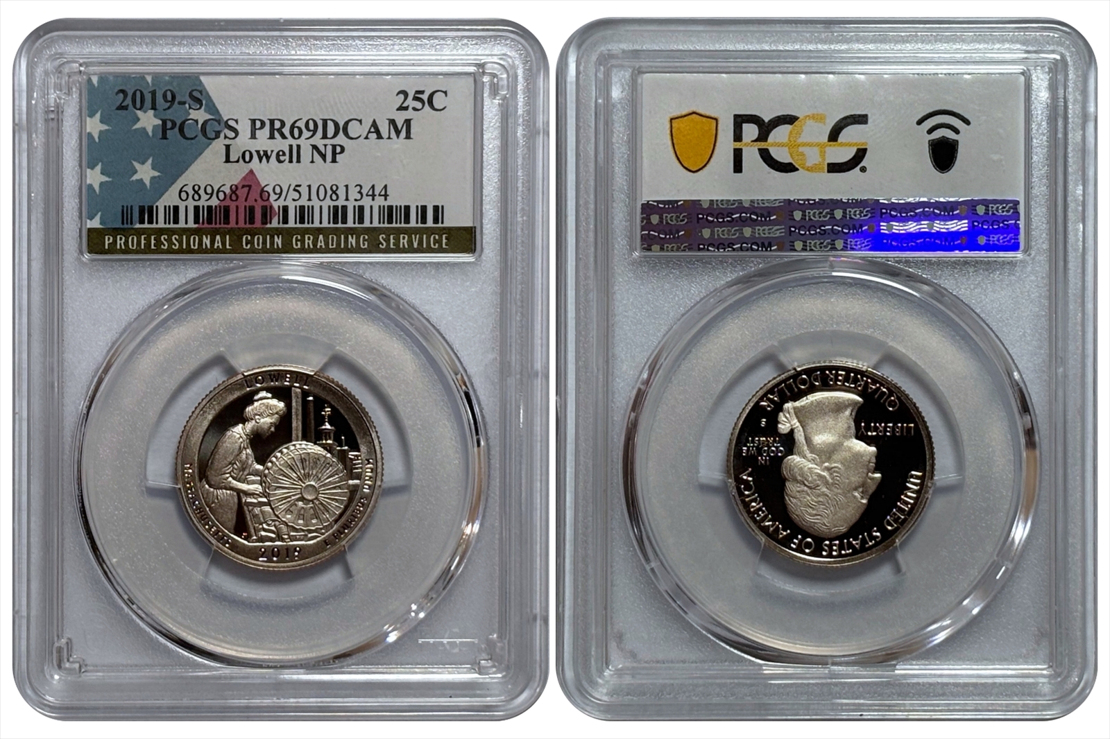 The 2019 Lowell National Historical Park Quarter was the first release of 2019 and the 46th overall issue in the America the Beautiful Quarters Program. The obverse features the classic portrait of George Washington, first introduced in 1932. The reverse depicts a mill girl working at a power loom, with a view of Lowell, including the Boott Mill clock tower, seen through the window. The inscriptions include Lowell, Massachusetts, 2019, and E Pluribus Unum.