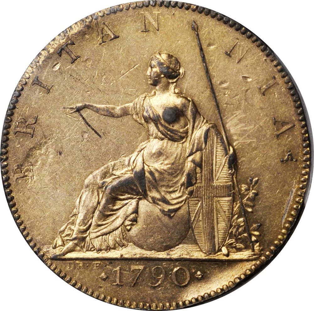 - GREAT BRITAIN. Gilt Copper 1/2 Penny Pattern, 1790. Soho (Birmingham) Mint. George III. PCGS Genuine--Tooled, AU Details Gold Shield.